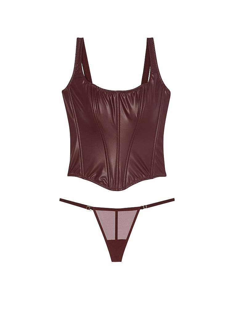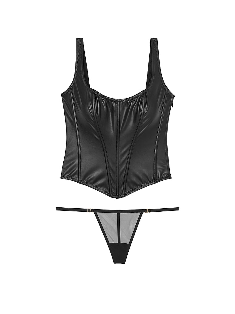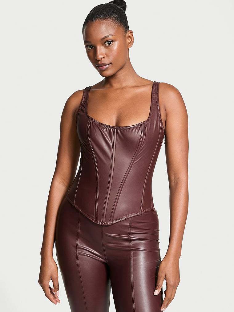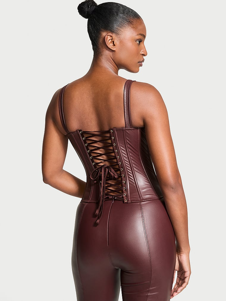 The quintessential corset is reimagined in edgy faux leather for a sexy style to wear in or out. Classic styling includes boning throughout, front hook-and-eye closures, and an adjustable lace-up detail in back.