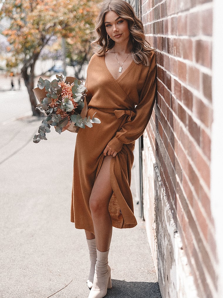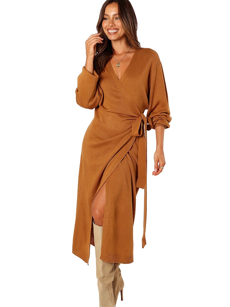 Cozy and sexy, this knit wrap midi dress has a crossover detail and self-ties at the waist, so you can give yourself the perfect fit.