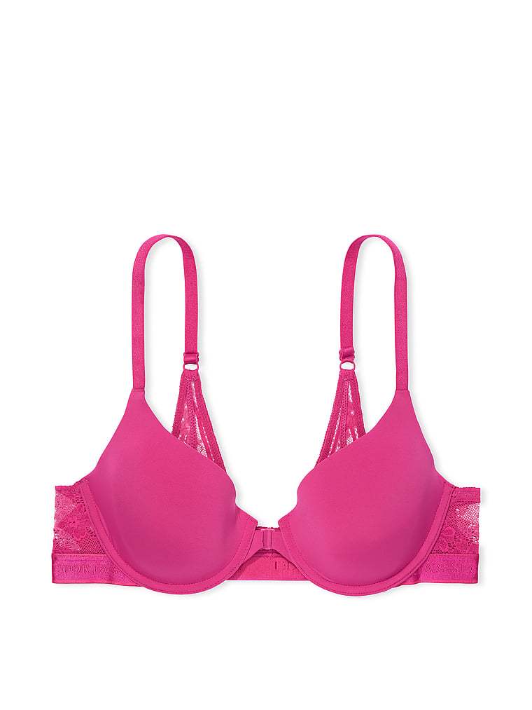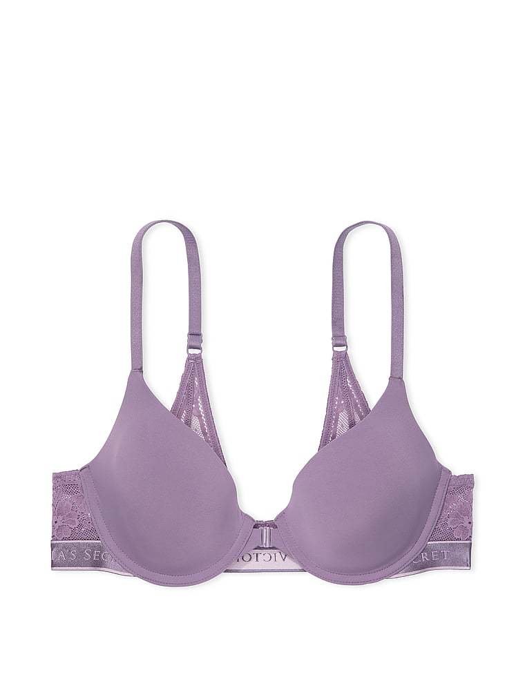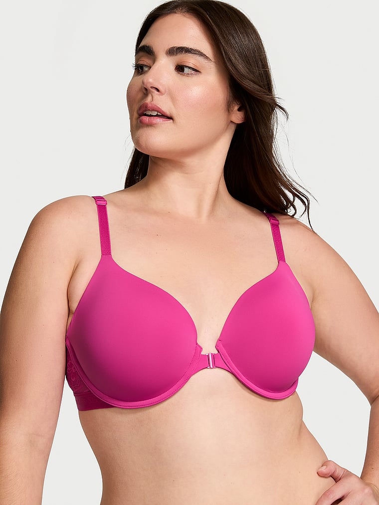 Featuring a front closure for easy on and off, our best-selling T-shirt bra is updated with a logo bottom band and femme lace details at the wings and back. The flawless, full-coverage fit features thin foam padding and comfortable underwire support.