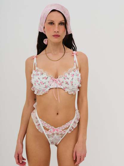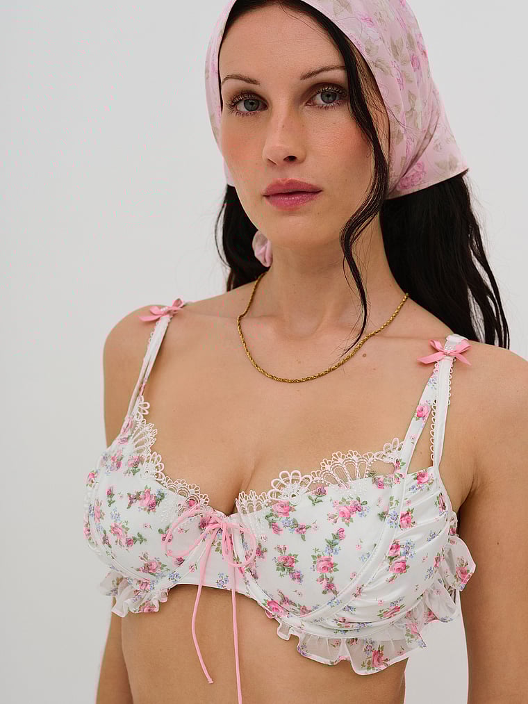 Made for the romantic muse, this underwire style features allover rose florals and a beautiful scalloped lace overlay. Accented with a pink skinny bow in front and fluttery ruffles at the lower edges of the cups.