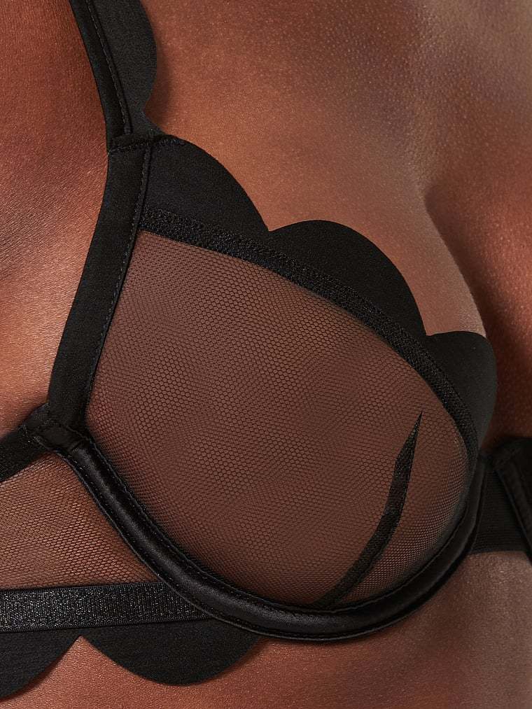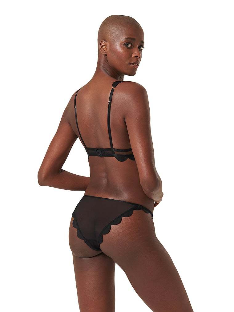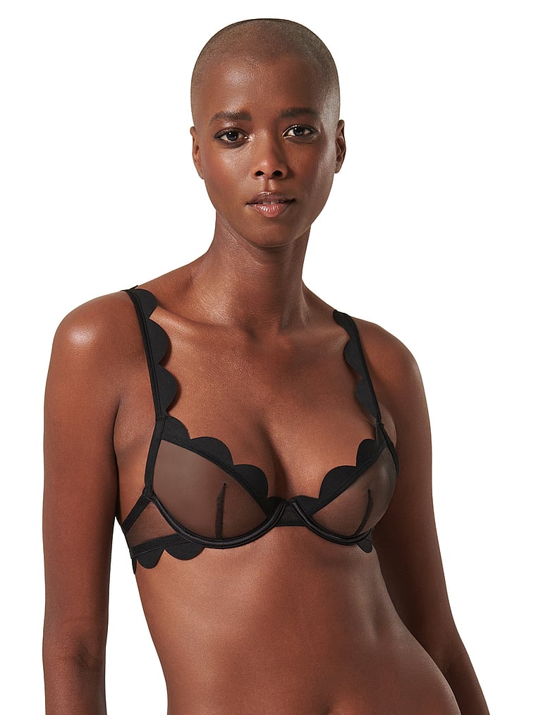Standout with contrasting scalloped edging and sheer mesh for a high-impact, low-effort look. Adjustable straps and a hook-and-eye fastening make for a perfect finished fit.