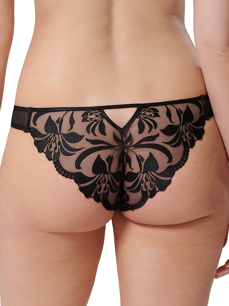 Sweet, floral-inspired embroidery offsets semi-sheer mesh in this style that has been constructed with a wide side strap for added comfort. Pair it with the Leonora Wired Bra to complete the look.