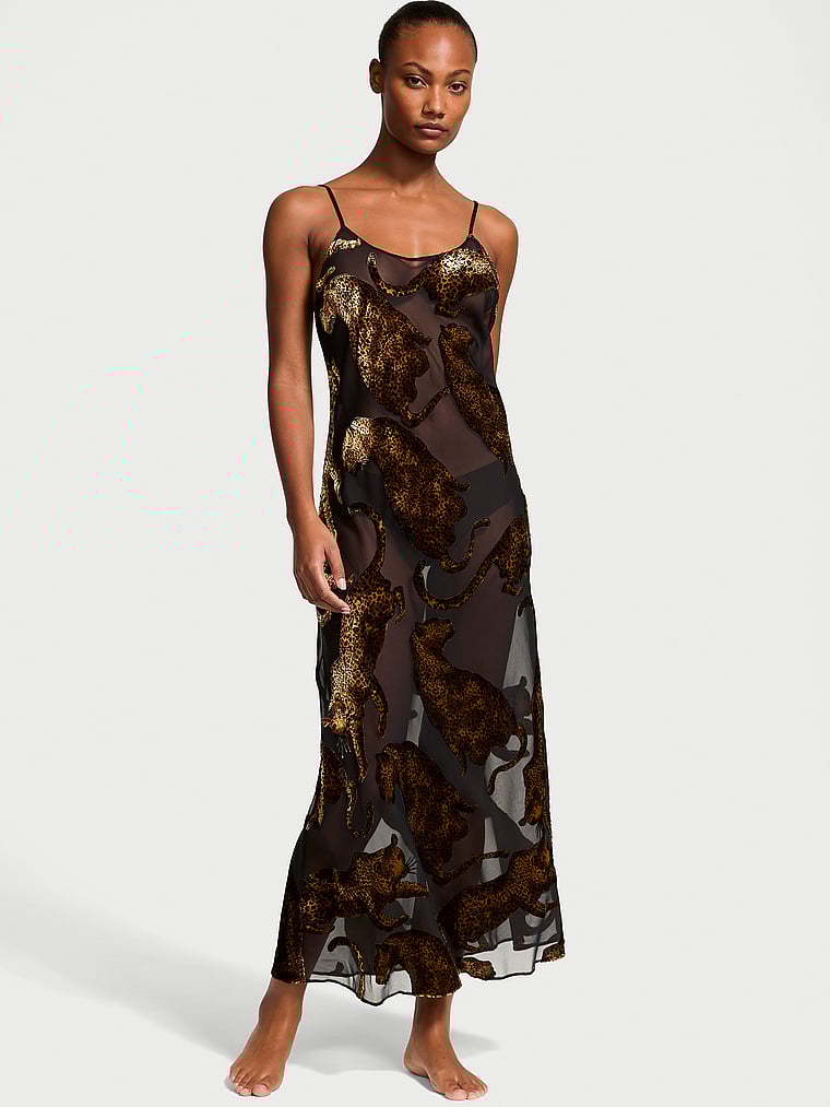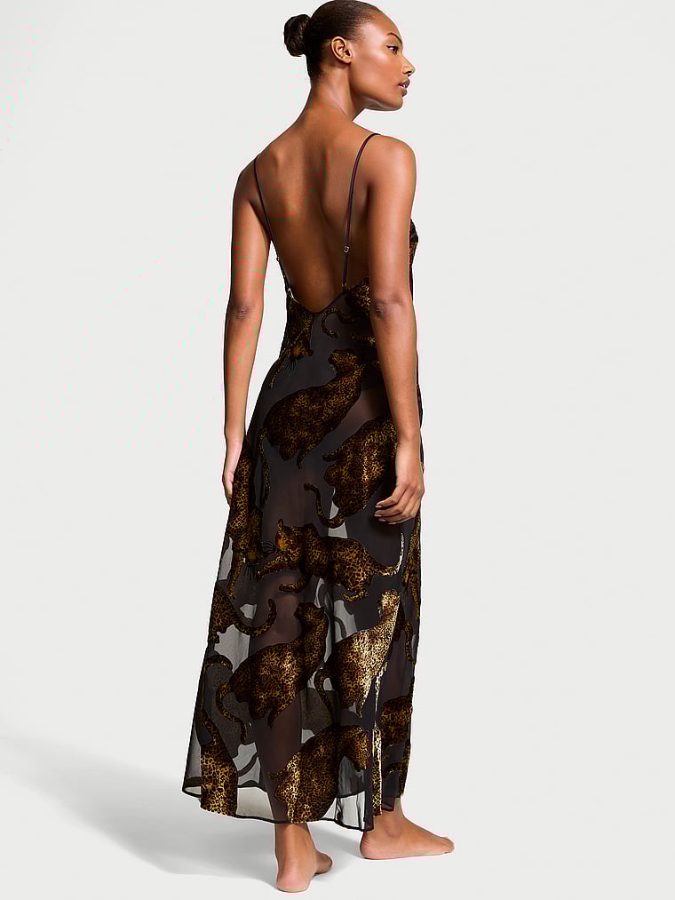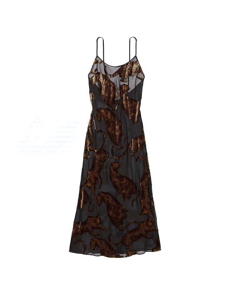 Velvety leopards cascade along the length of this stunning slip that showcases your silhouette. A plunging back and delicate straps up the sexiness of this chic look.