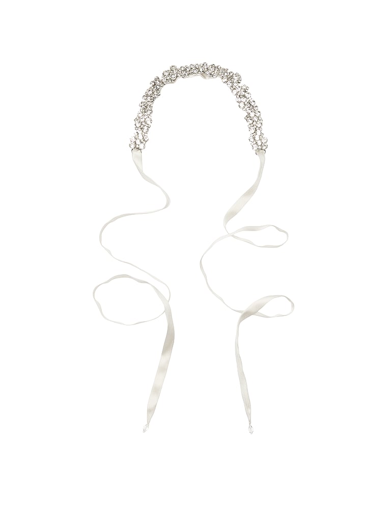 The crowning touch to your statement style, this glittering, crystal-encrusted headpiece secures with flowing silk ribbons.