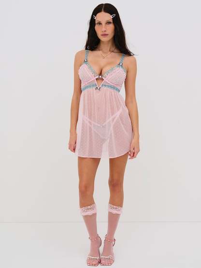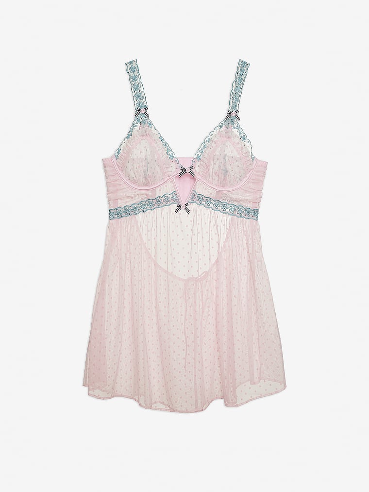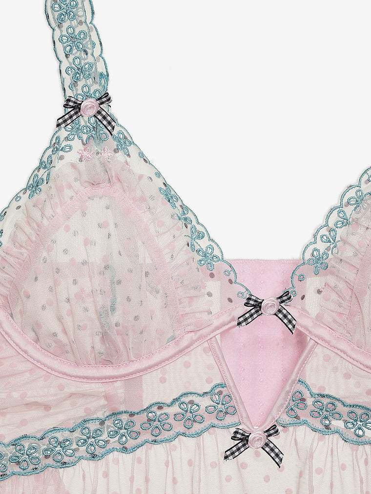 A babydoll style crafted in a sexy, sheer dotted mesh fabric. This dreamy design features gathered cups with a ruffled mesh overlay for added intrigue.