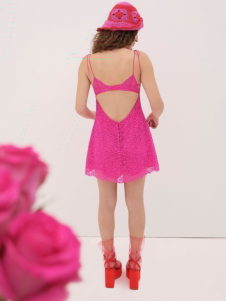 Set hearts aflutter with breezy butterfly lace on this vibrant dress, finished with skinny tie straps, satin rosettes, and a daring open back.