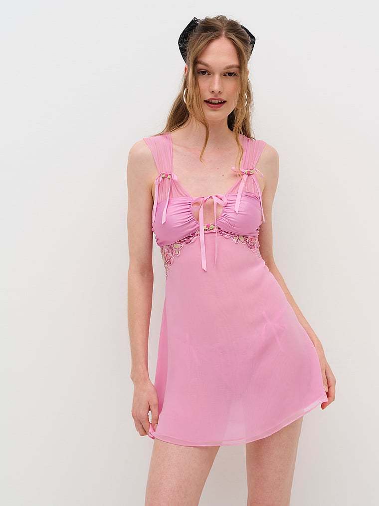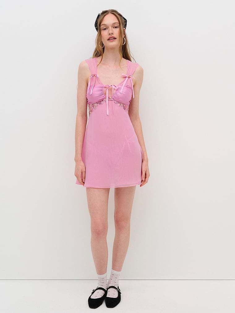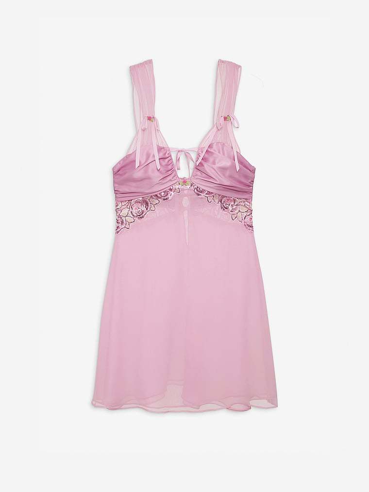 Inspired by vintage slip dresses, this one is oh-so-romantic with sequin-adorned floral trim, decorative rosettes, and sweet ribbon bows throughout.