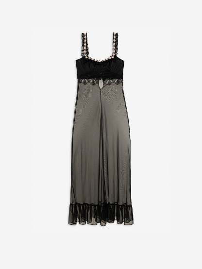 Slip into vintage Paris when you relax in this maxi-length dress with a ruched bust and sheer flowing skirt.