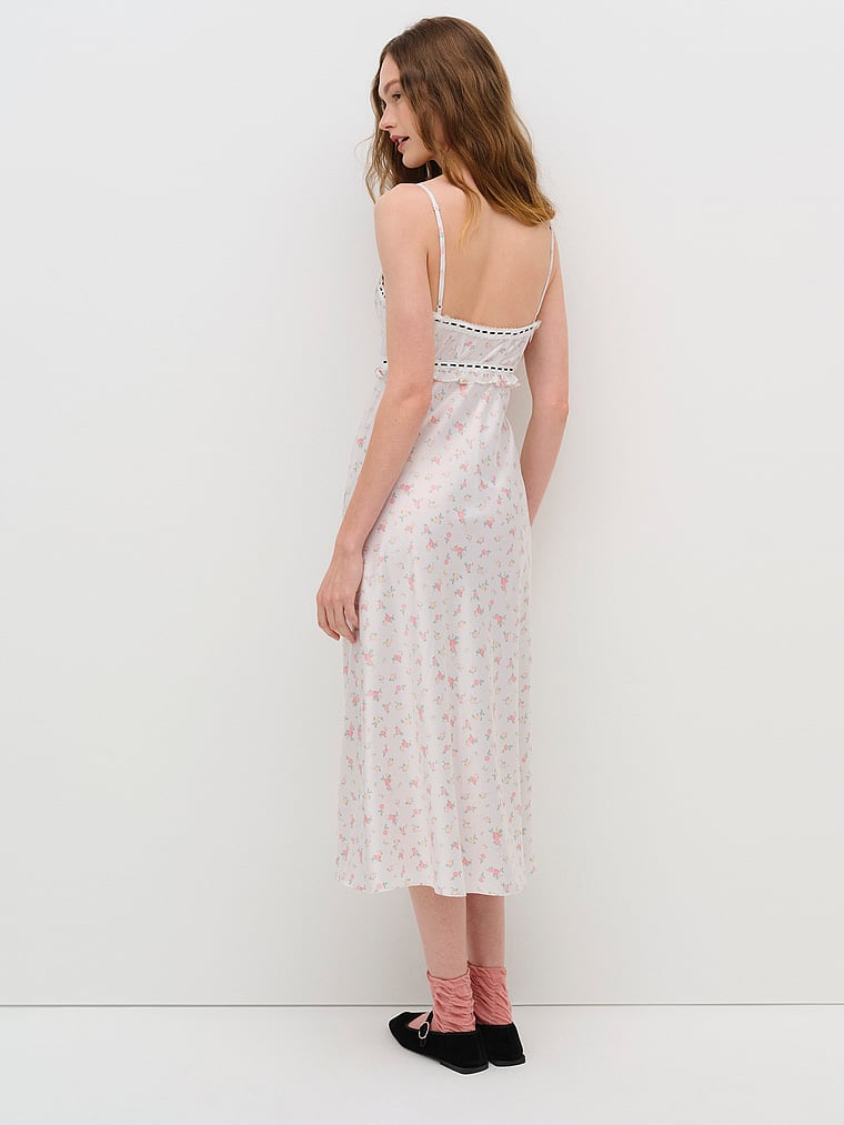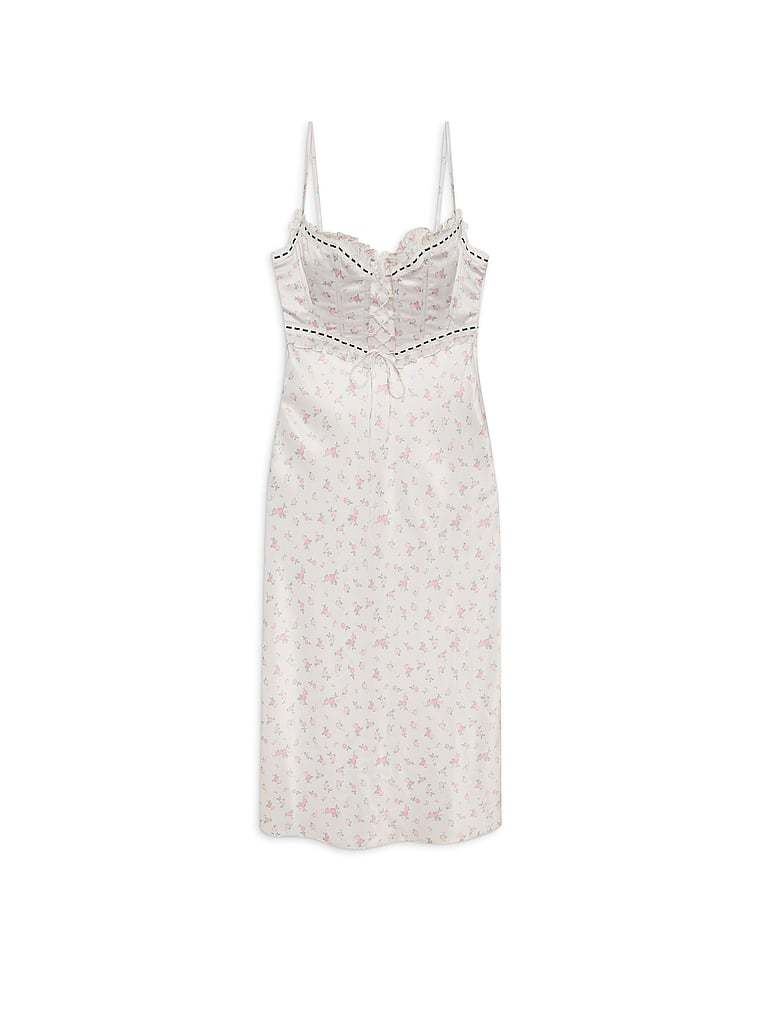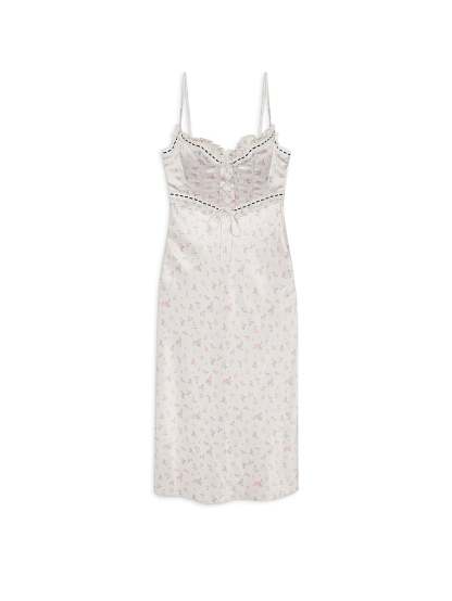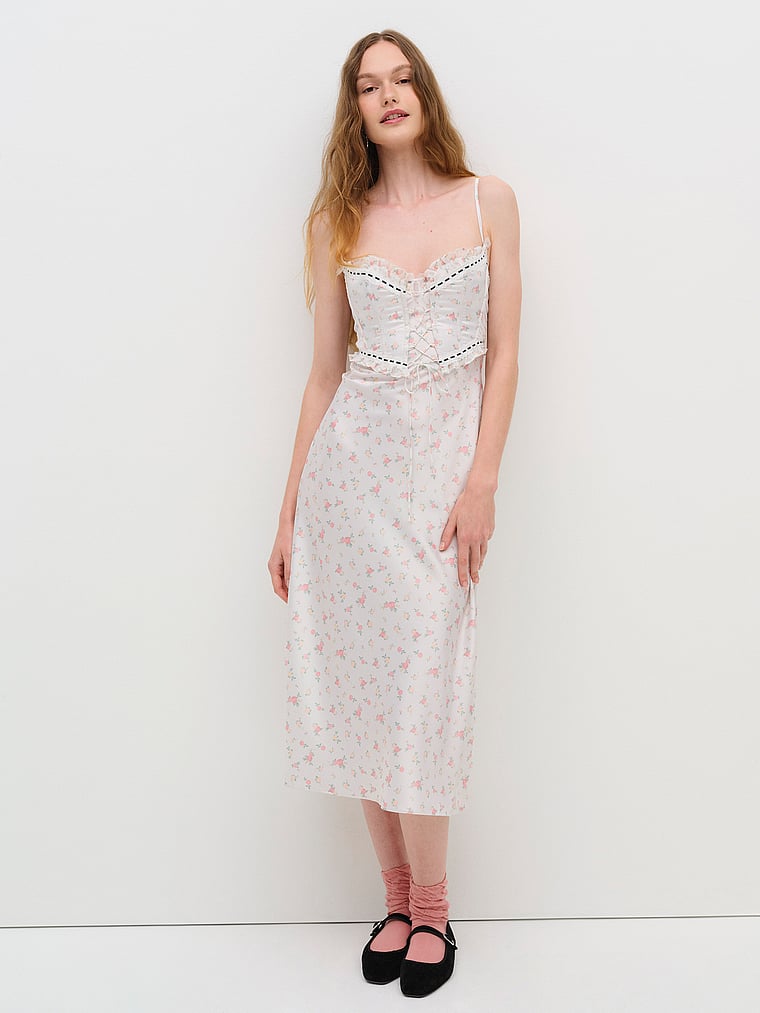 The picture of elegance, no matter how you wear it: This slip dress is crafted in a floral printed satin with ruched cups and a built-in corset overlayer.