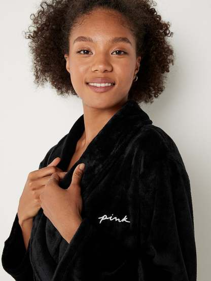 An extra-cozy robe meant for pampering yourself, featuring a shawl collar, tie waist, front pockets and our script logo at the back.
