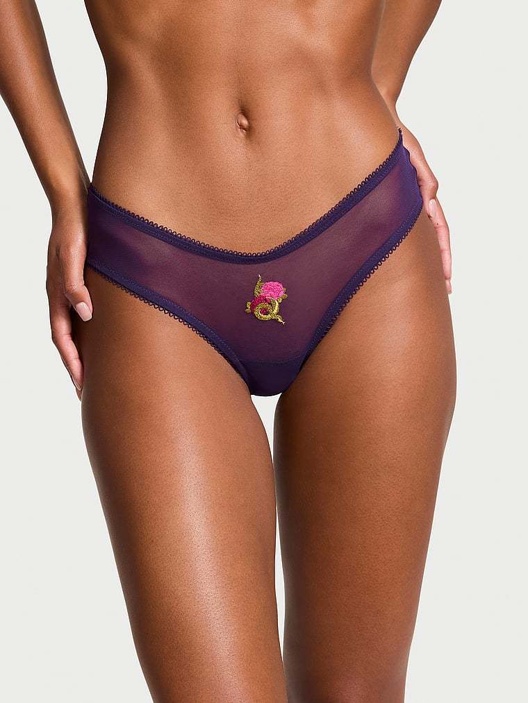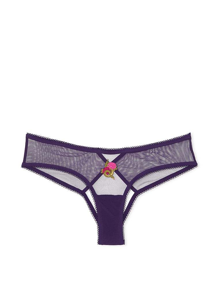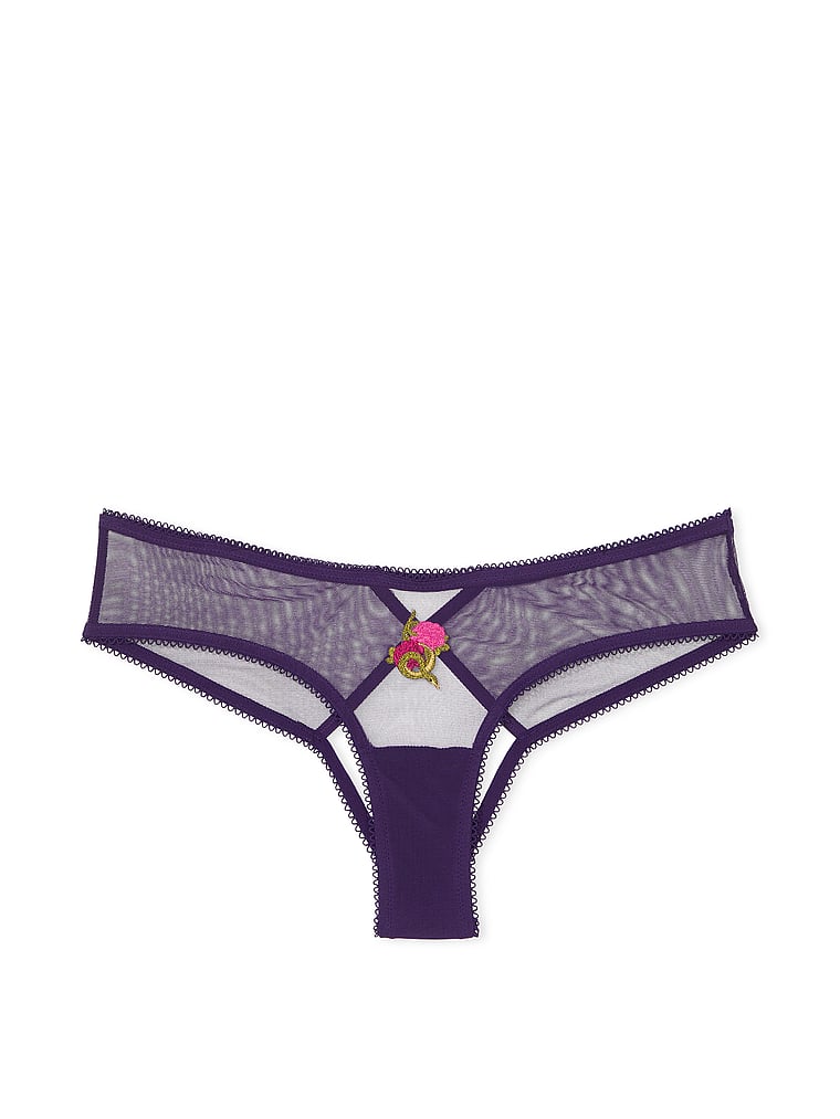 Playful embroidery adds distinctive definition to this open-back mesh panty.
