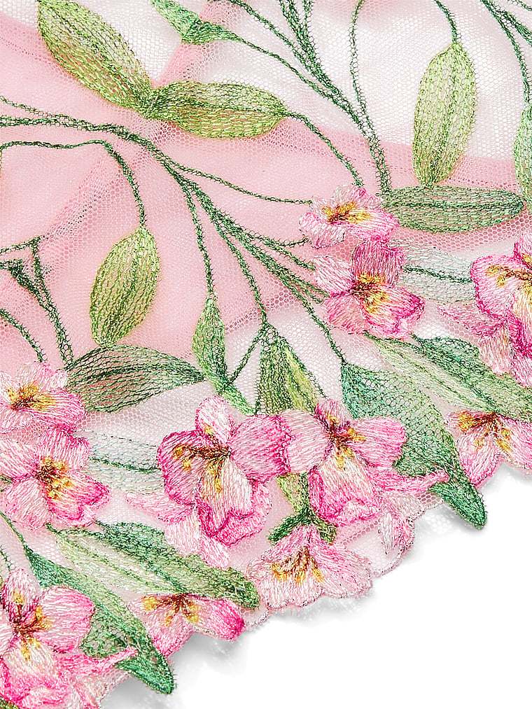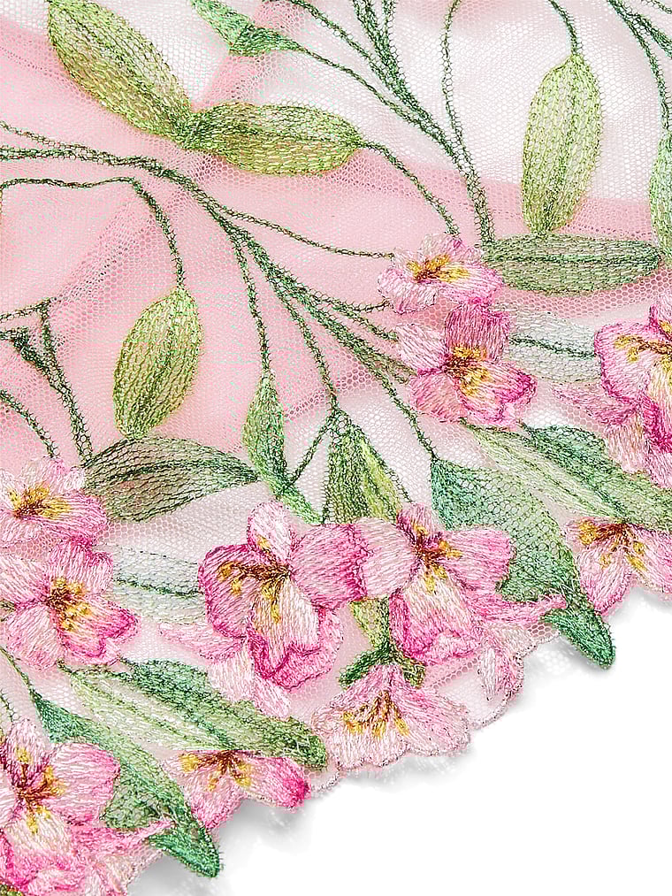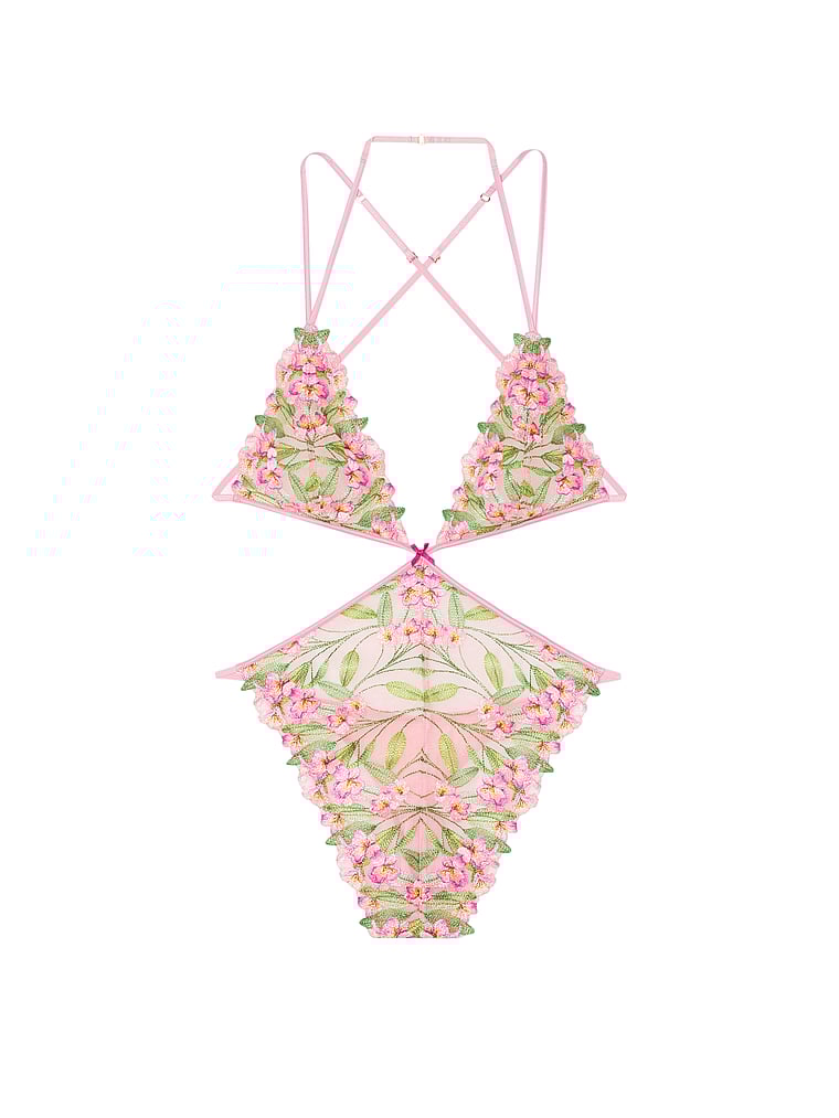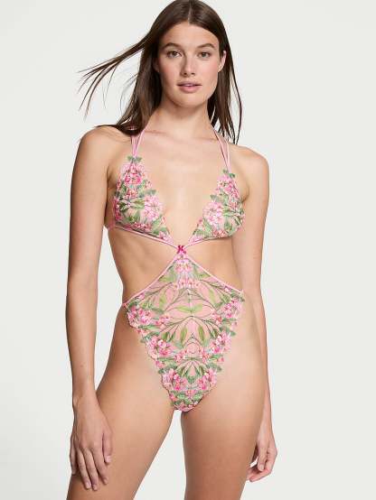 Showcasing our shimmery, Swiss-designed floral embroidery, this sexy, open-back bodysuit is made to get attention��in and out of the bedroom.
