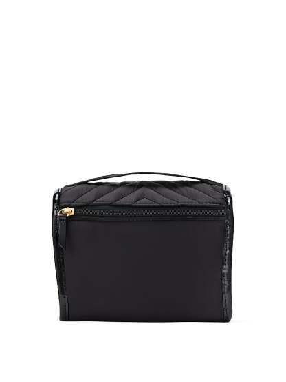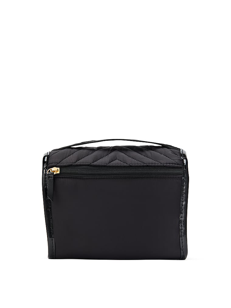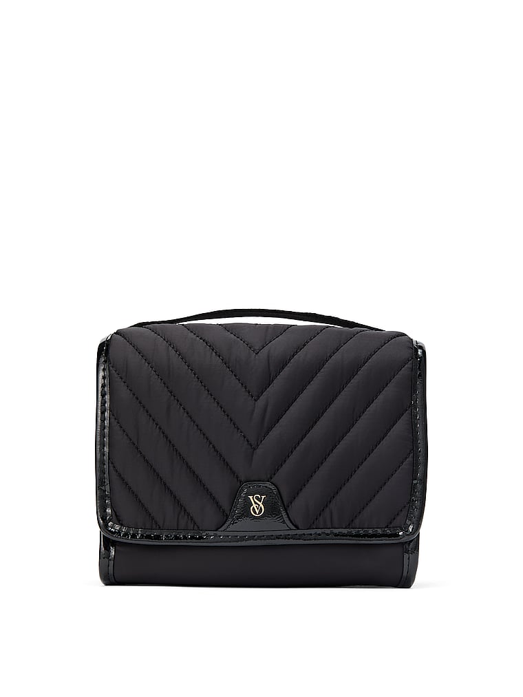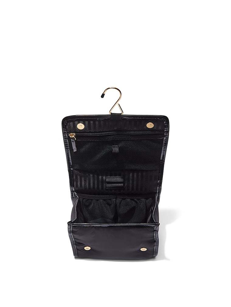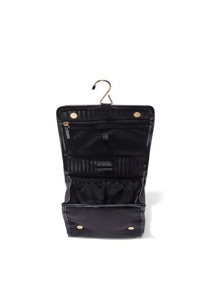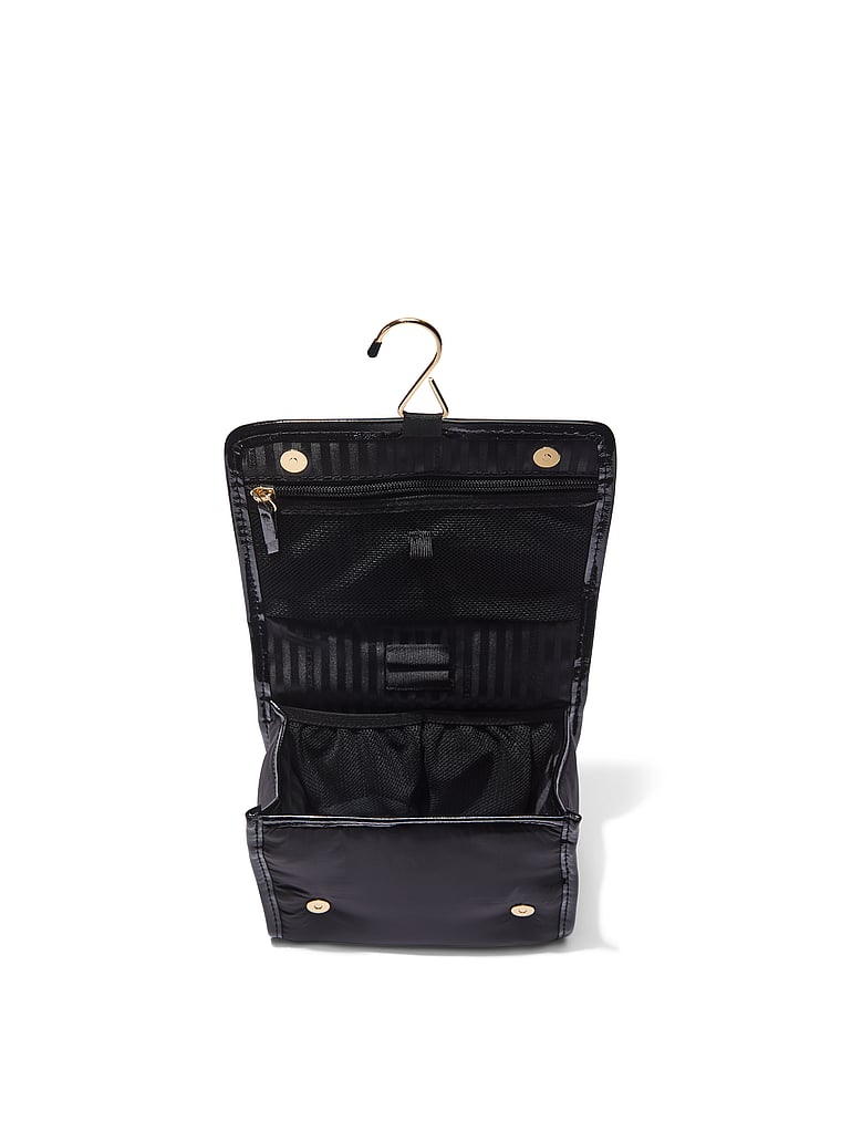 This soft beauty bag packs down flat and features handy slots inside for storage. An optional hook lets you hang it as you get ready.