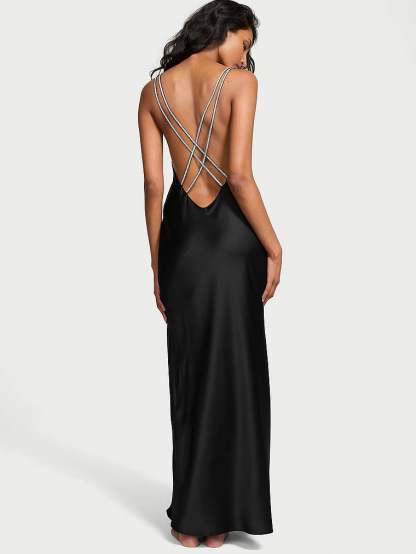 Wow them��coming and going��in a glamorous length of glossy satin made to skim your silhouette. It turns around to reveal an array of straps at the plunging back, offset with hundreds of glittering crystals.