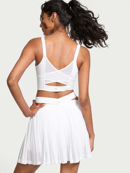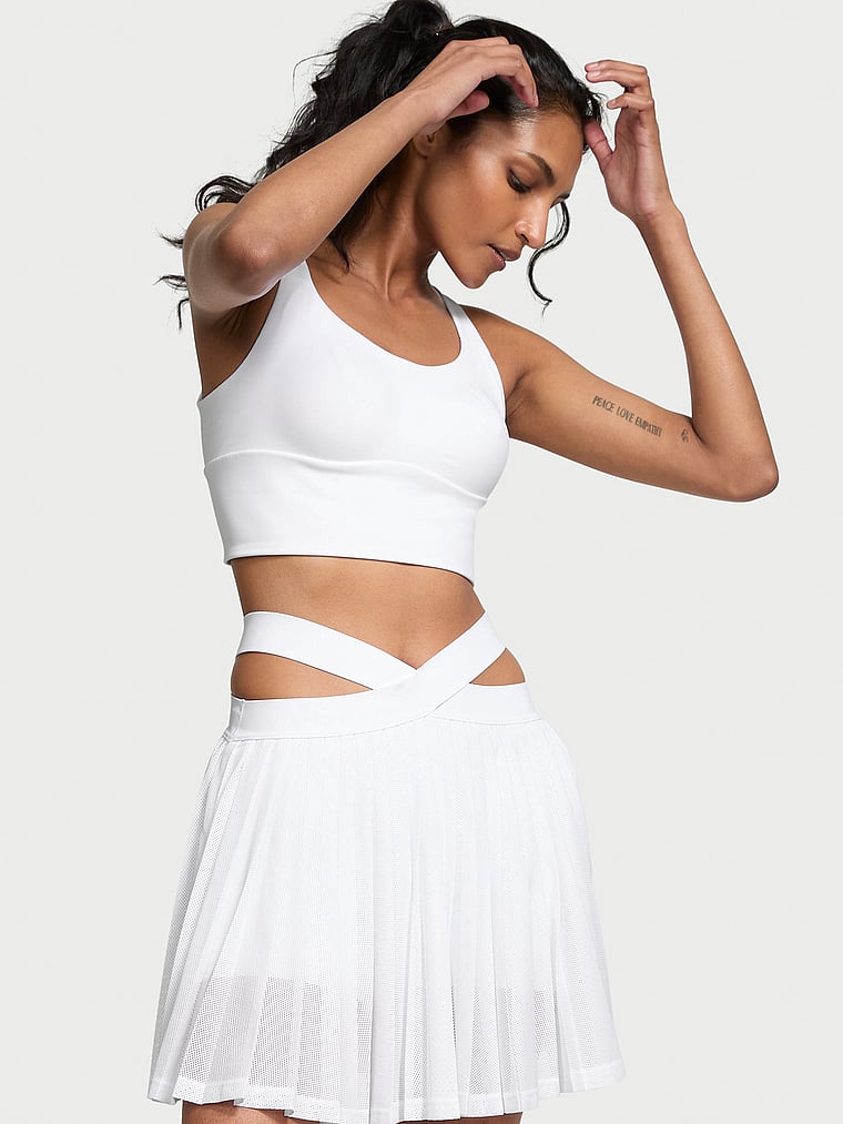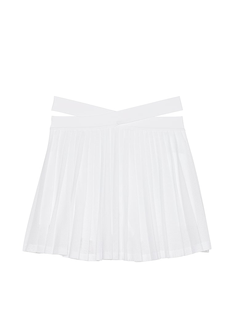Strappy cutout details at the waistband of this swingy mesh skirt add a sexy element to a wear-everywhere sporty style. Complete with built-in shorties with pockets for your phone and other necessities.