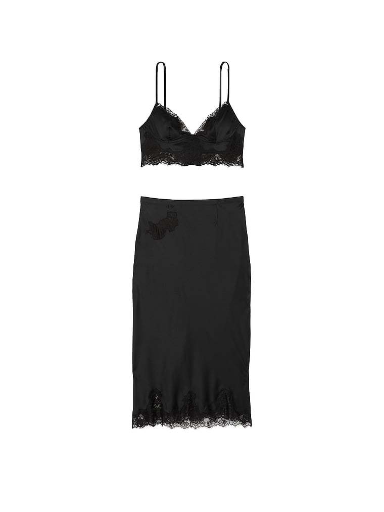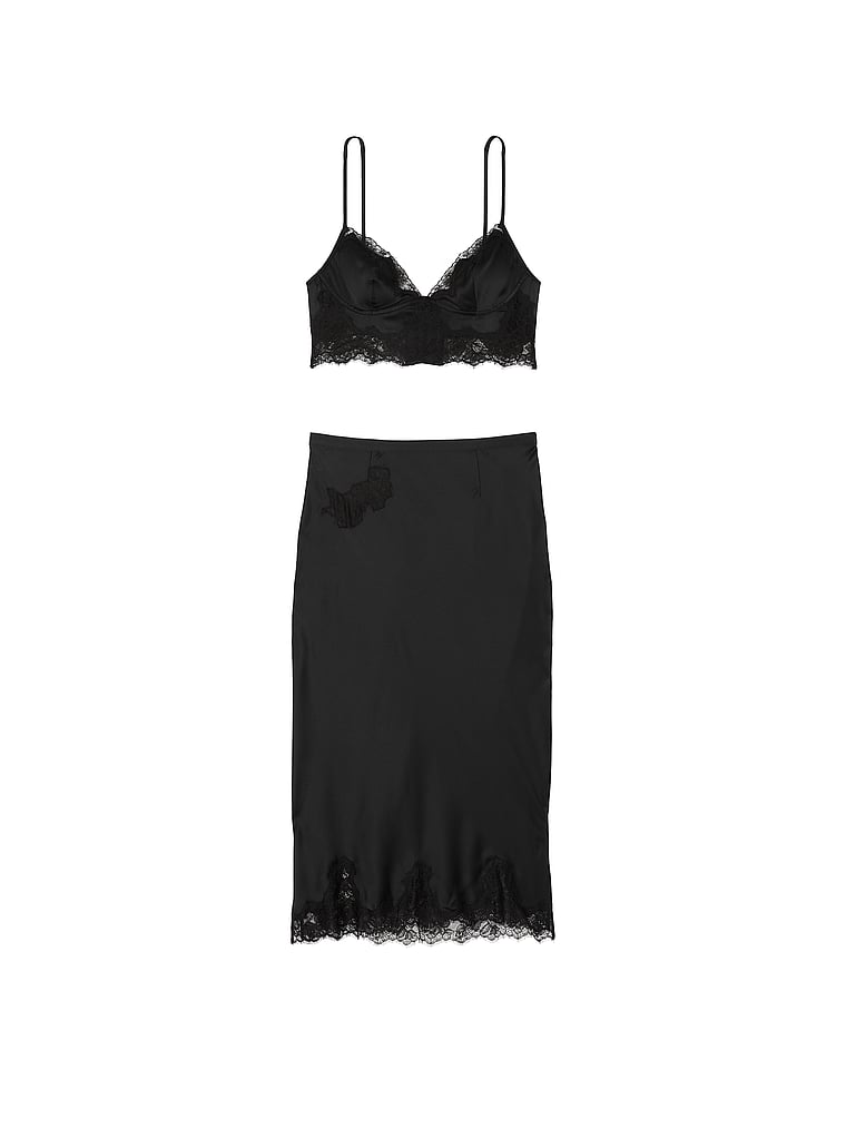Based on a statement style featured in the first-ever VS fashion show, this two-piece ensemble gets sexy right. From the glossy satin with elegant lace details to the chic proportions, this set makes any occasion a moment.