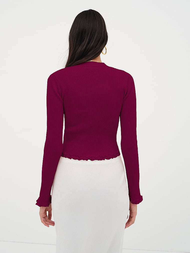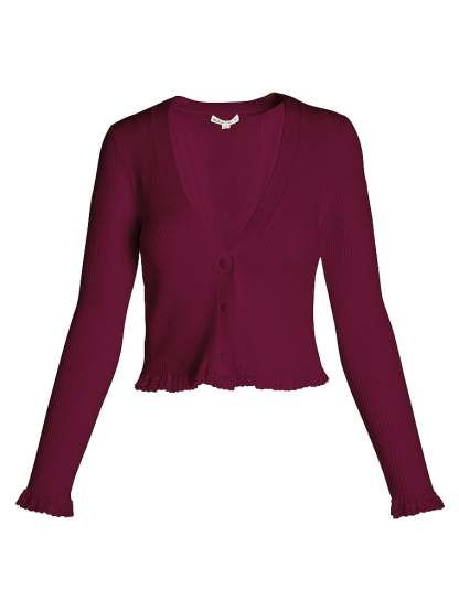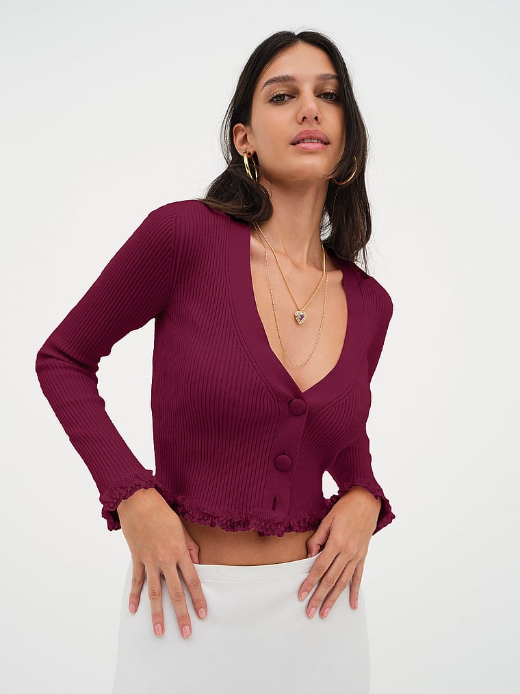 A spring wardrobe staple with a nostalgic feel, this sweet cardigan is constructed from a soft, ribbed fabric. A romantic lace trim completes the look.