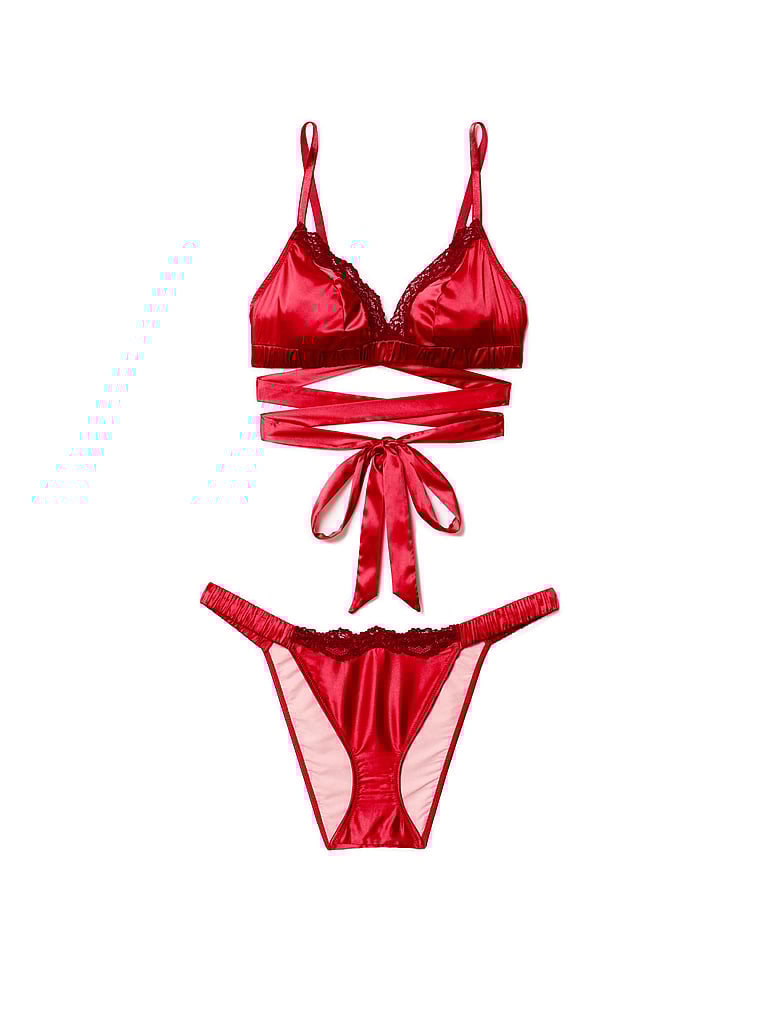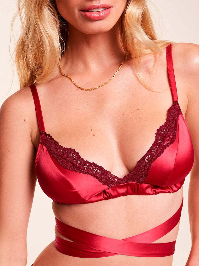 This silky, stretch-satin bralette showcases a feminine, ballet-wrap design. Scrunchy elastic detail and a touch of lace finish off the style.