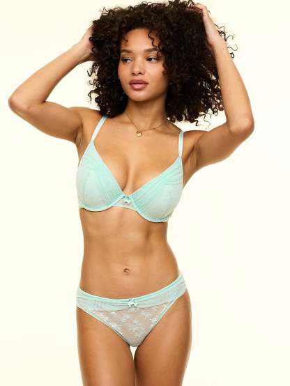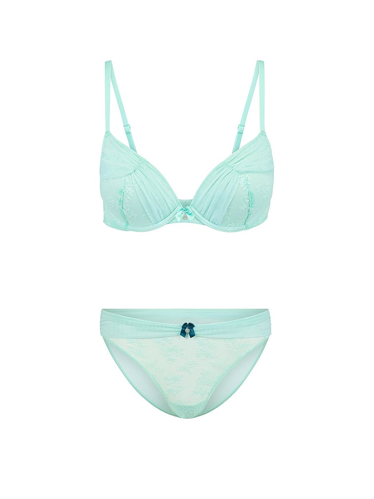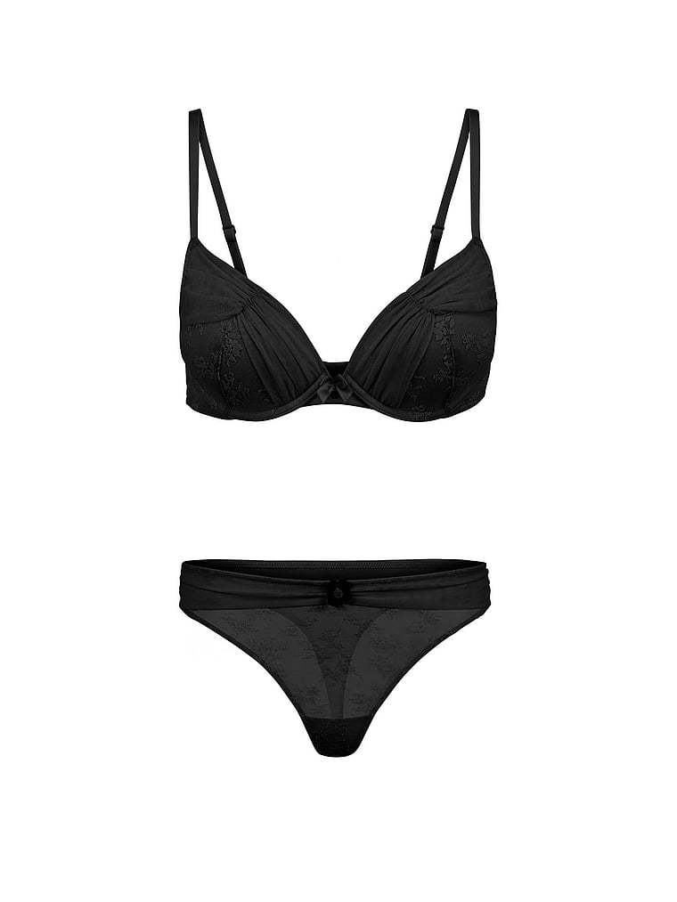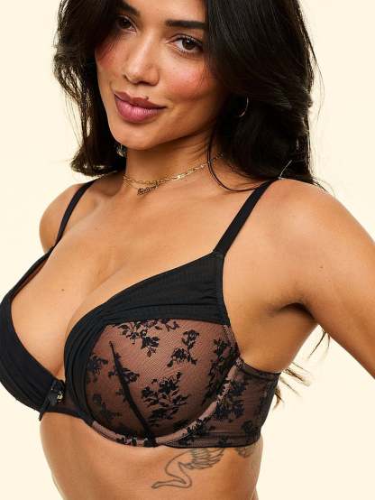 One part sexy, one part pretty, this bra offers a plunge push-up with ruched mesh cups and delicate lace trim.