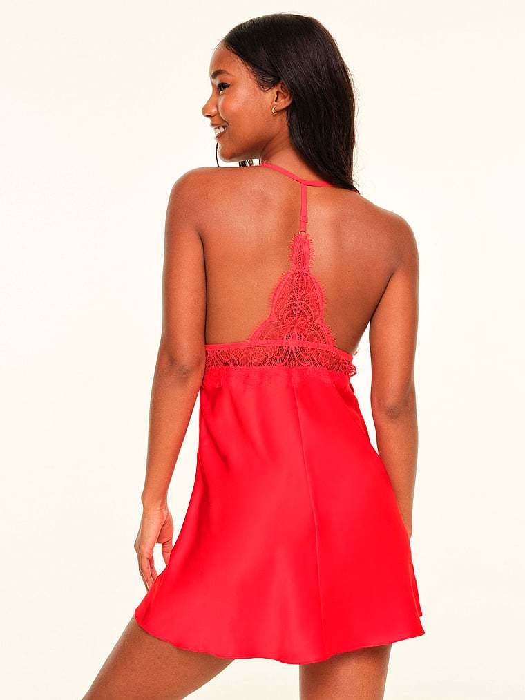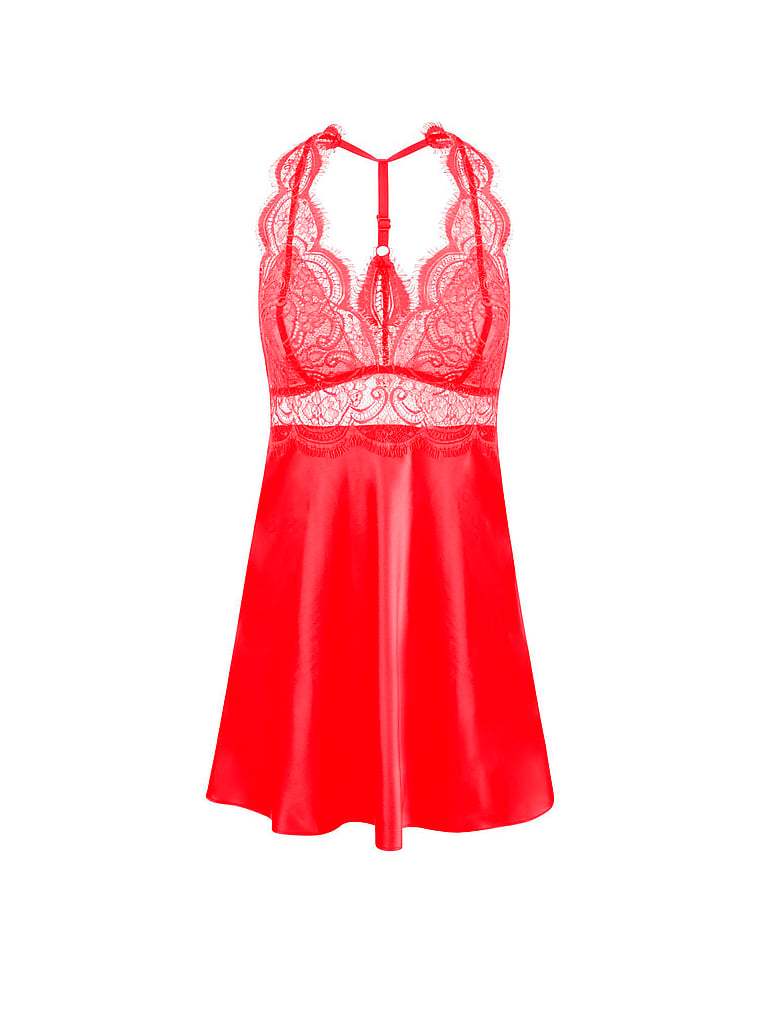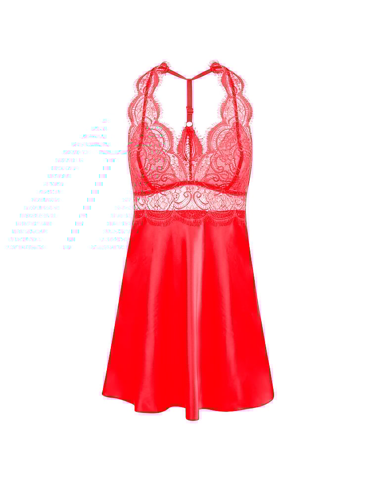 This satin slip features a plunging neckline, mesh-lined cups, and a lace racerback��all designed to flatter your figure from every direction. The high-apex lace cups give this style a sexy look, perfect for a special night in.