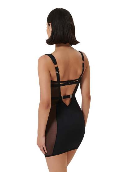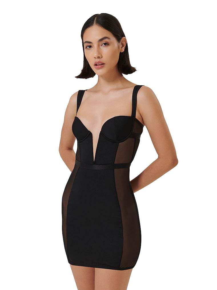 A powerful silhouette shaped by sculpting mesh side panels and a daring plunge neck makes this chemise an easy choice for a bold night in.