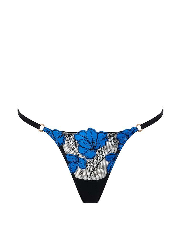 A striking addition to your lingerie collection, this Thong has blue and black floral embroidery on sheer mesh for a look that's peekaboo and so pretty.