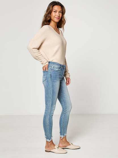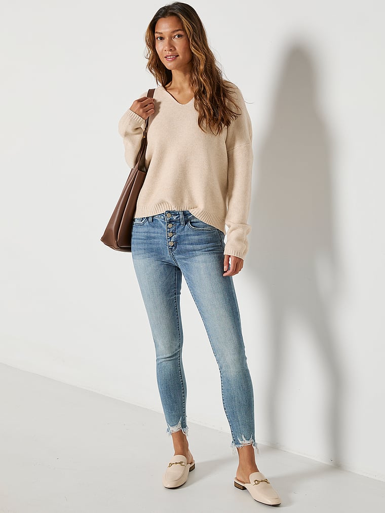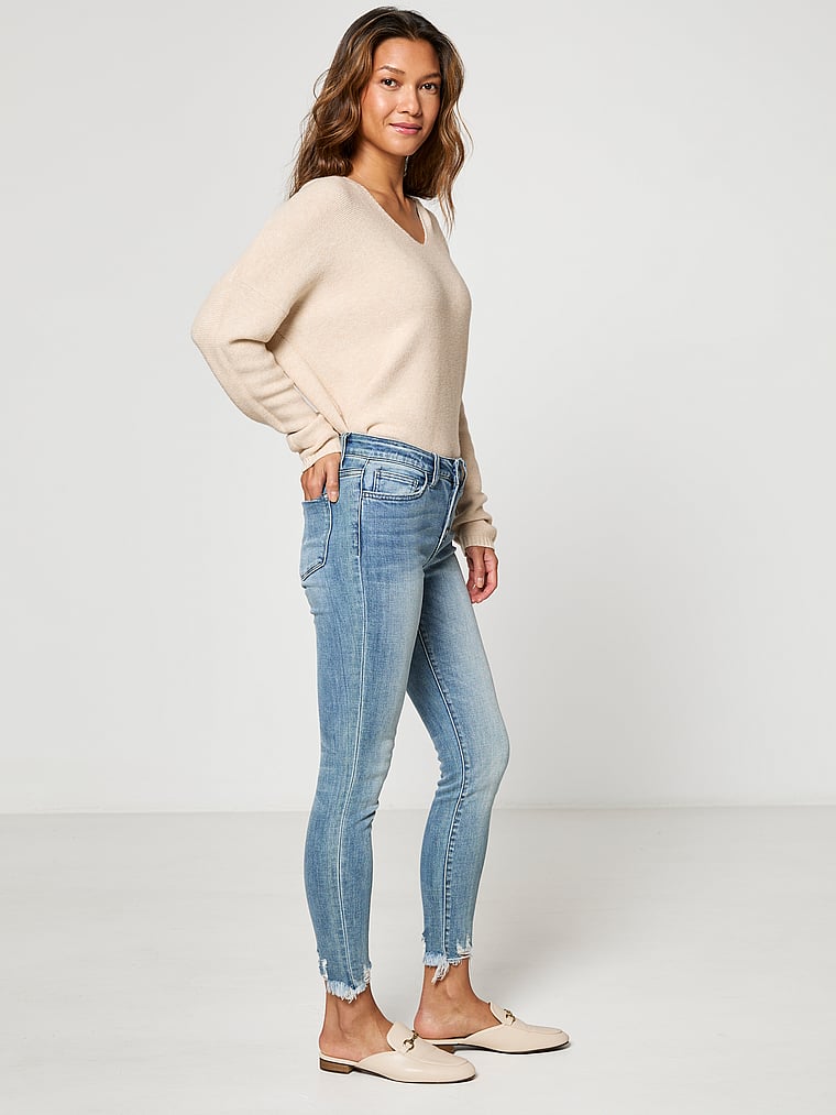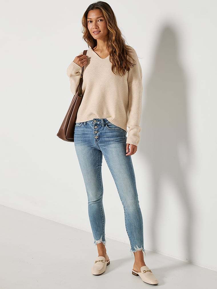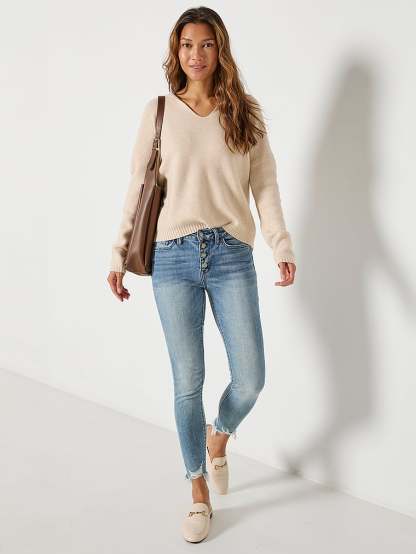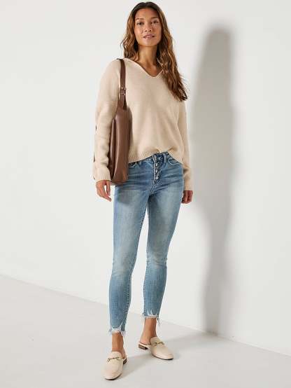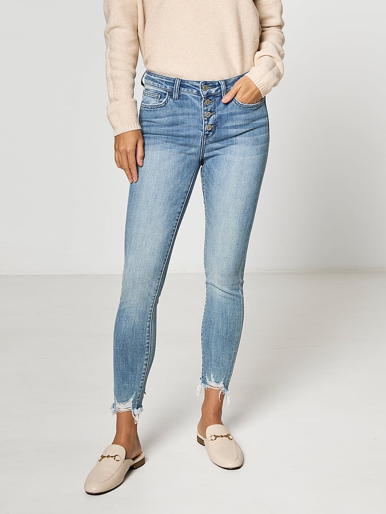 Meet your new go-to pair that adds a stylish edge to every look. These laid-back, distressed jeans have a mid-rise fit with a button-up front. Made complete with their cropped length.