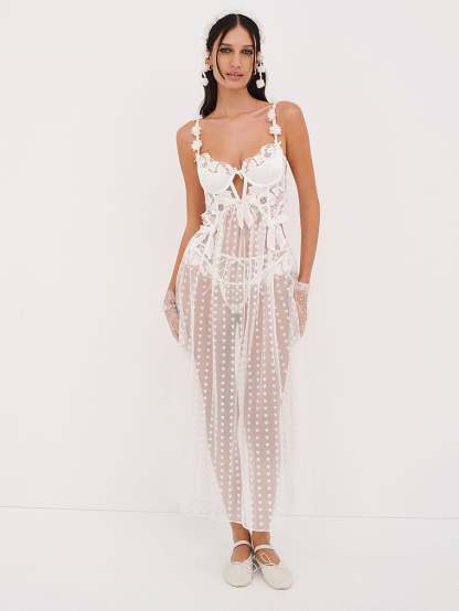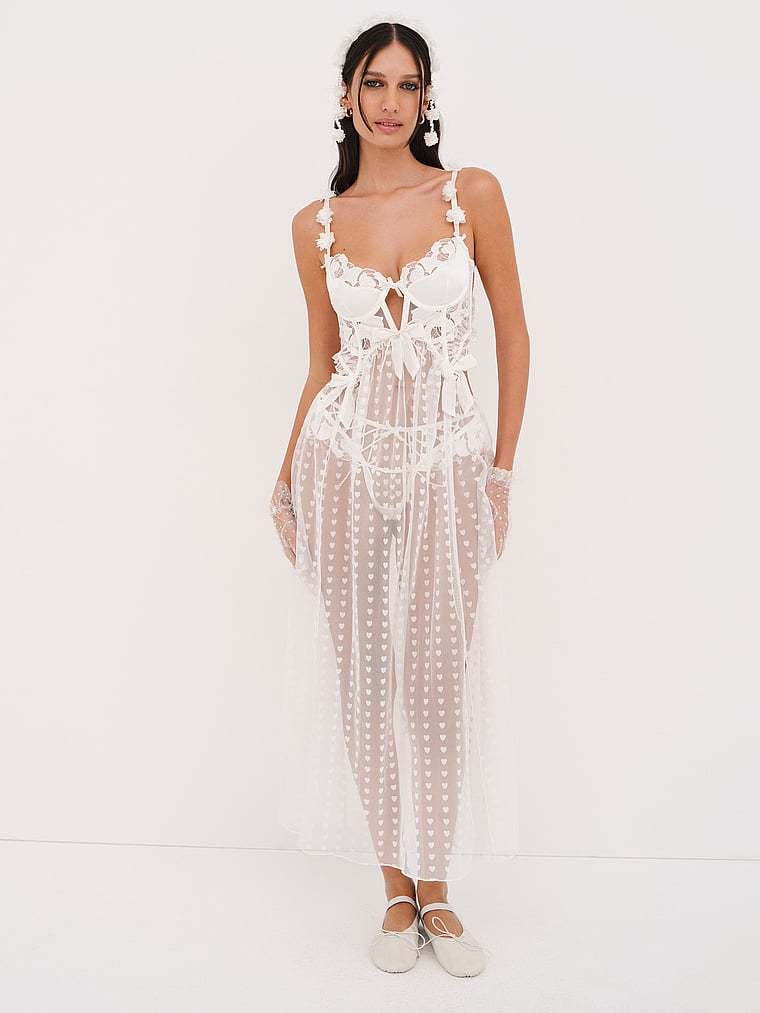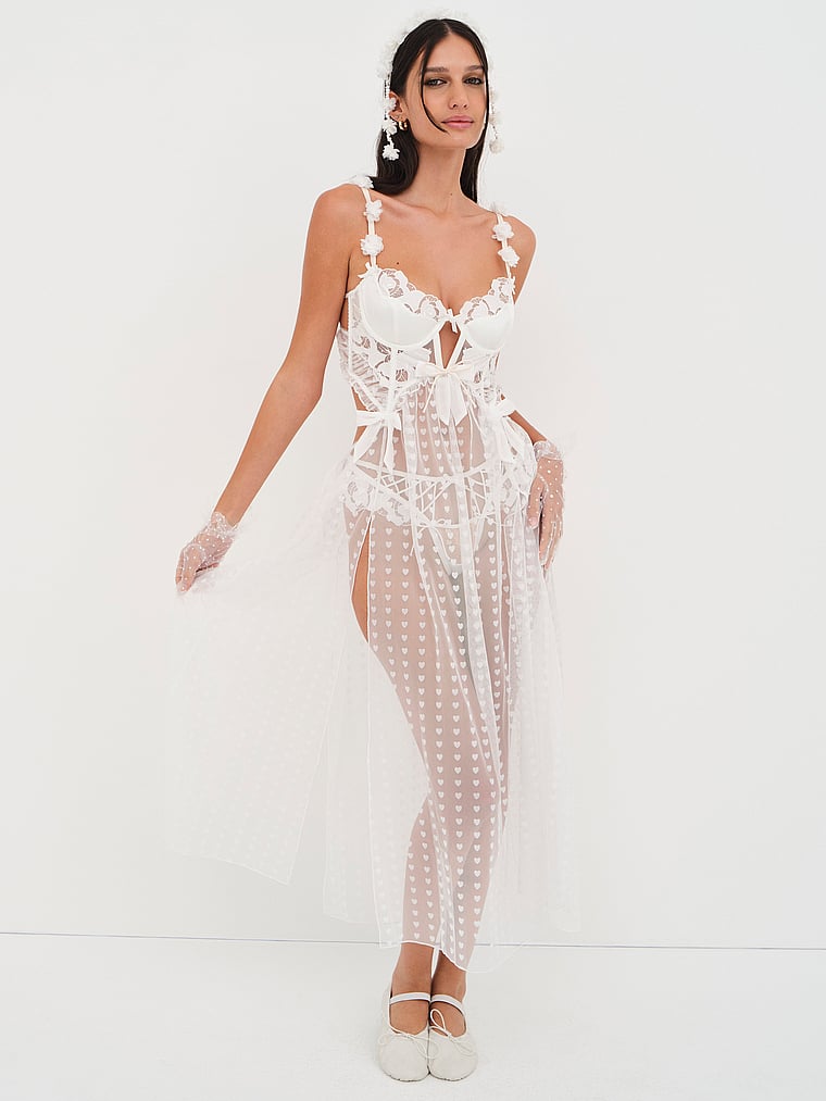 Bursting with love for your big day, a ruched bodice skims your curves while floral embroidery and heart details add a romantic touch on this vintage-inspired style. Pair it with the Amore Lace Panty to complete the look.