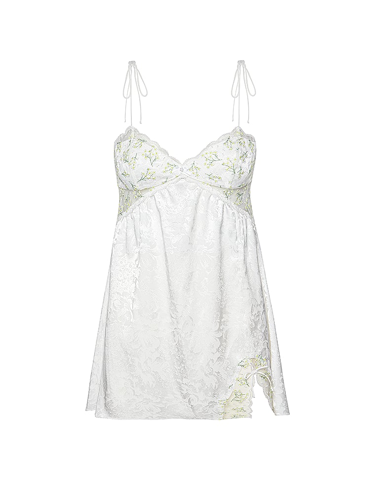 A spray of baby’s breath blooms lends a delicate romance to this pure white mini slip with a built-in bra. Featuring embroidered tulle, luxe satin jacquard, ultra skinny tie straps, and a side slit for a look that’s not-so-innocent.