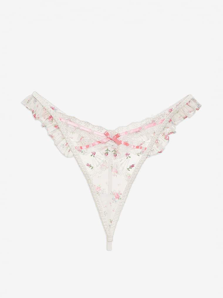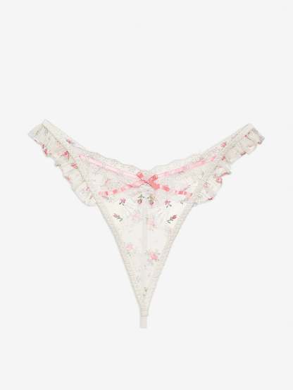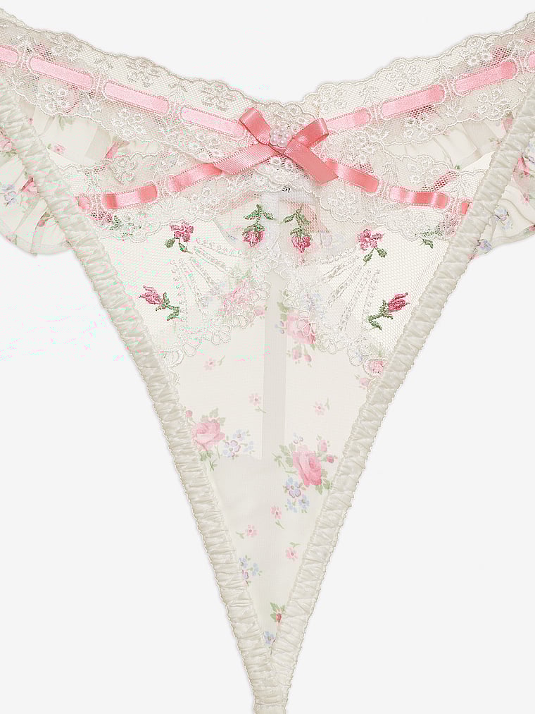 This sweet style is adorned in a romantic floral rose print, vintage-inspired lace, and ribbon trims. Playful ruffles at the leg give an ultra-feminine finish.