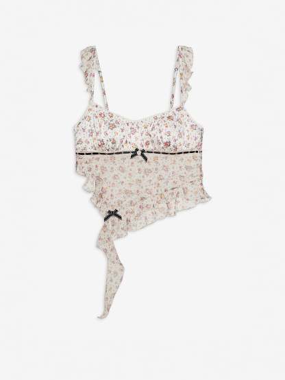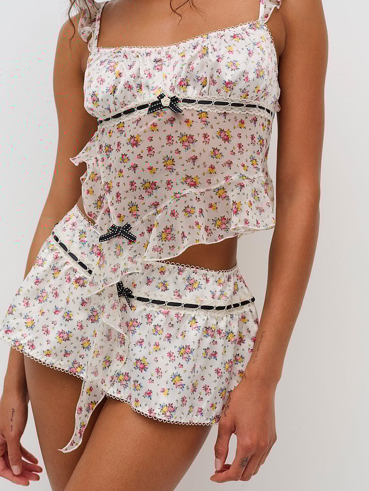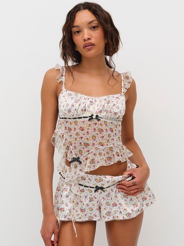 An allover floral print with black contrast velvet trim makes this sleep top both sweet and sexy. Fluttery and feminine, it has adjustable straps and ruffles, too.