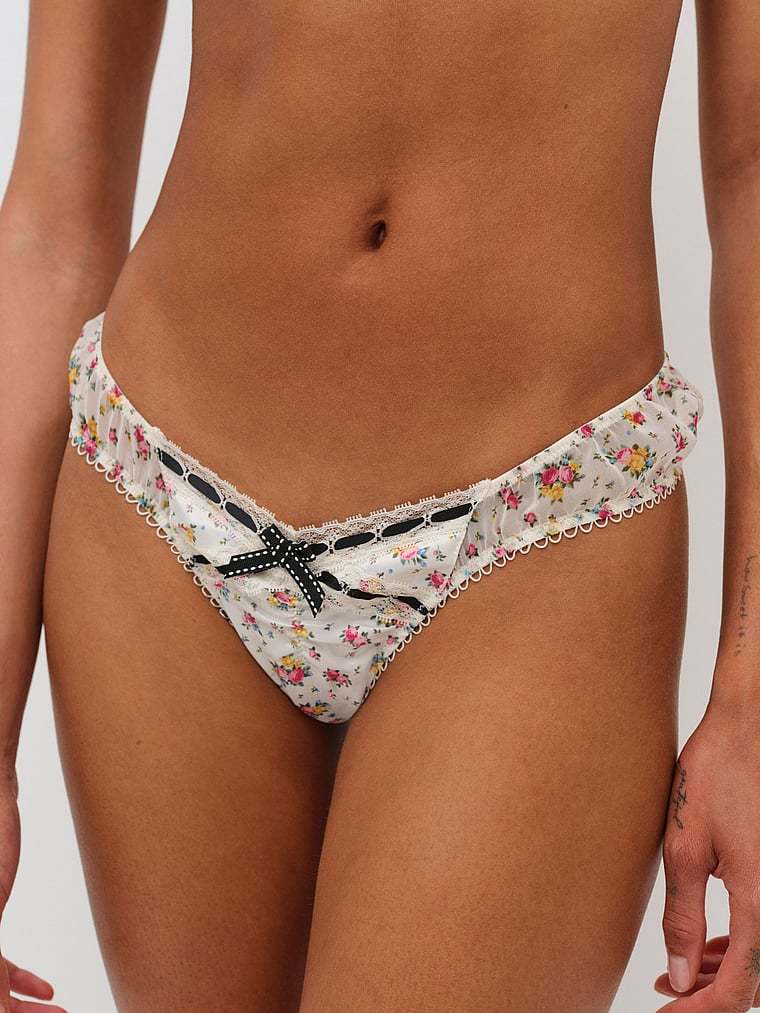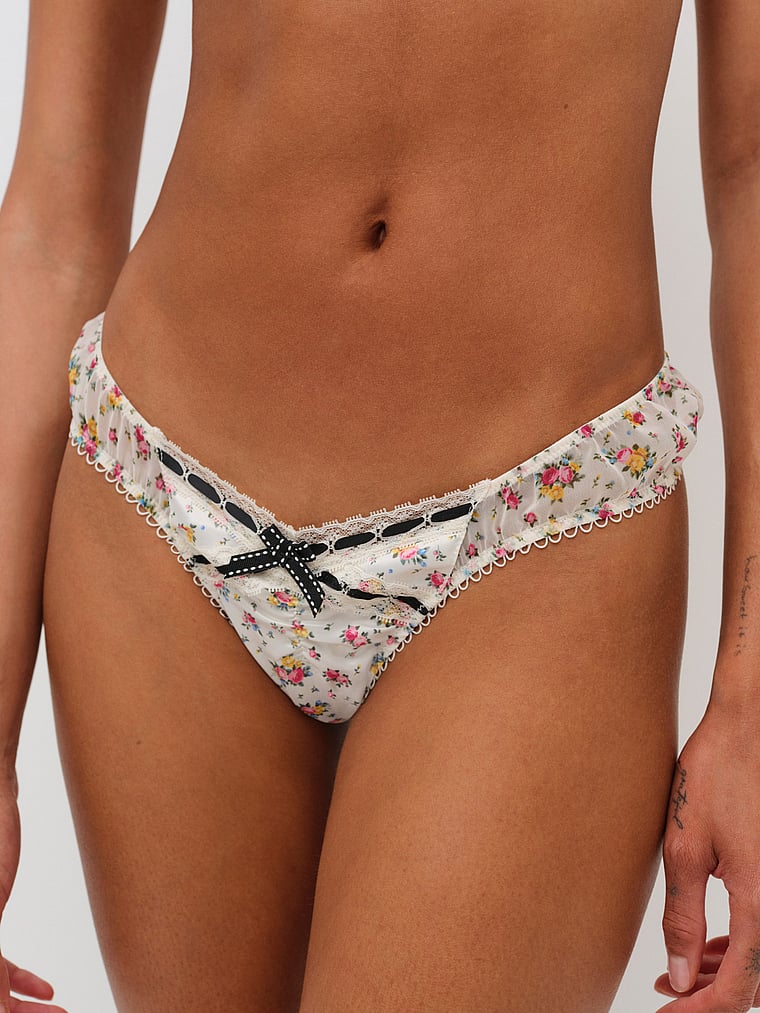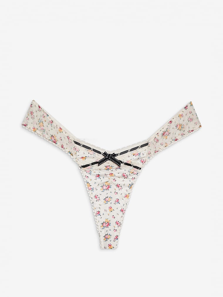 An allover floral print with black contrast velvet trim makes this thong panty both sweet and sexy. Fluttery and feminine, it has loop trim, too.
