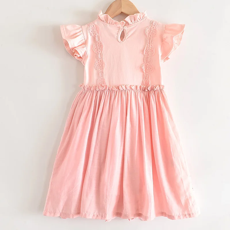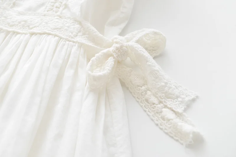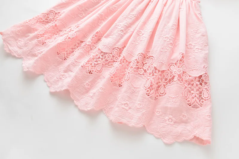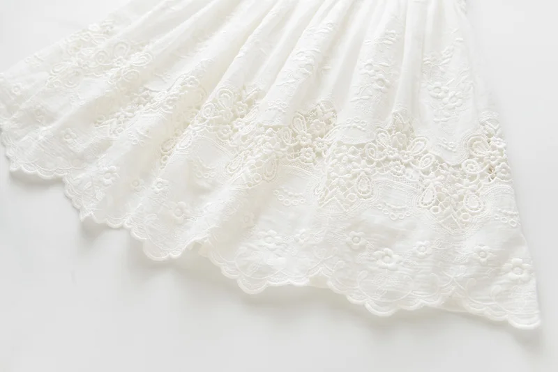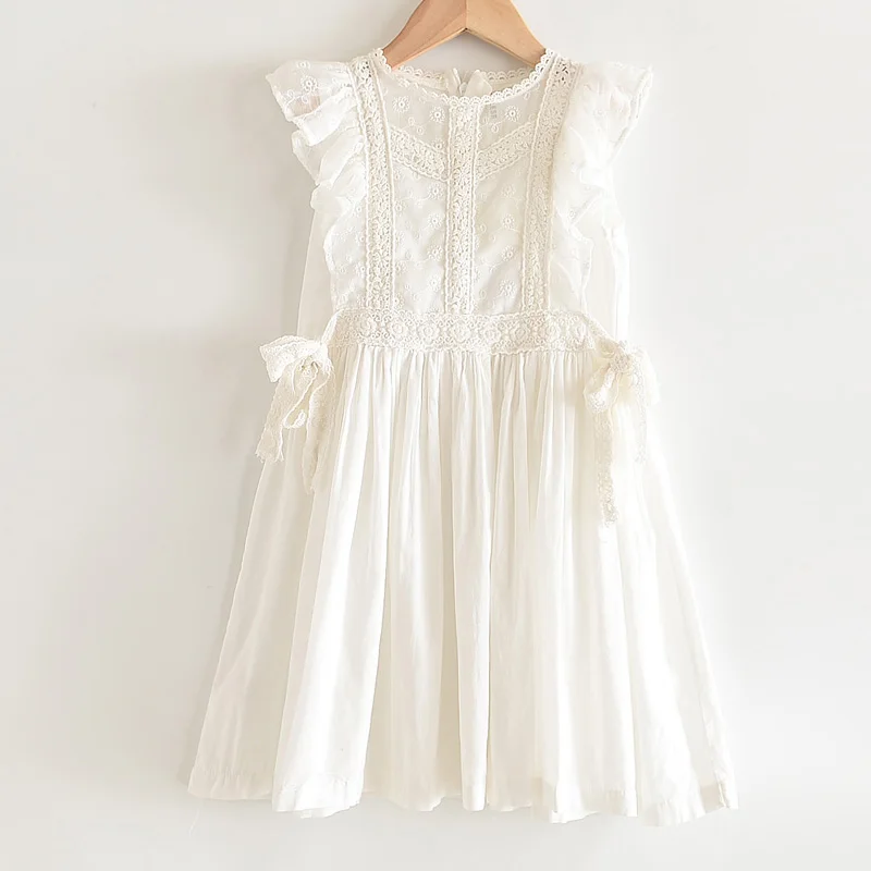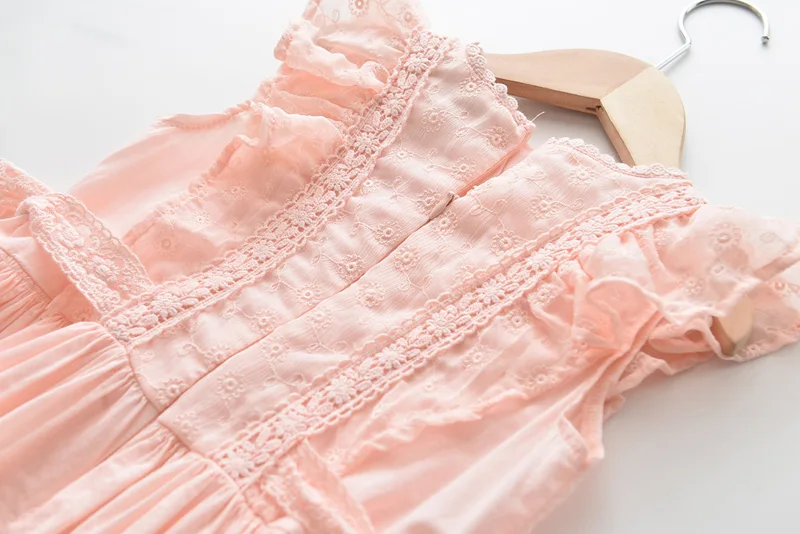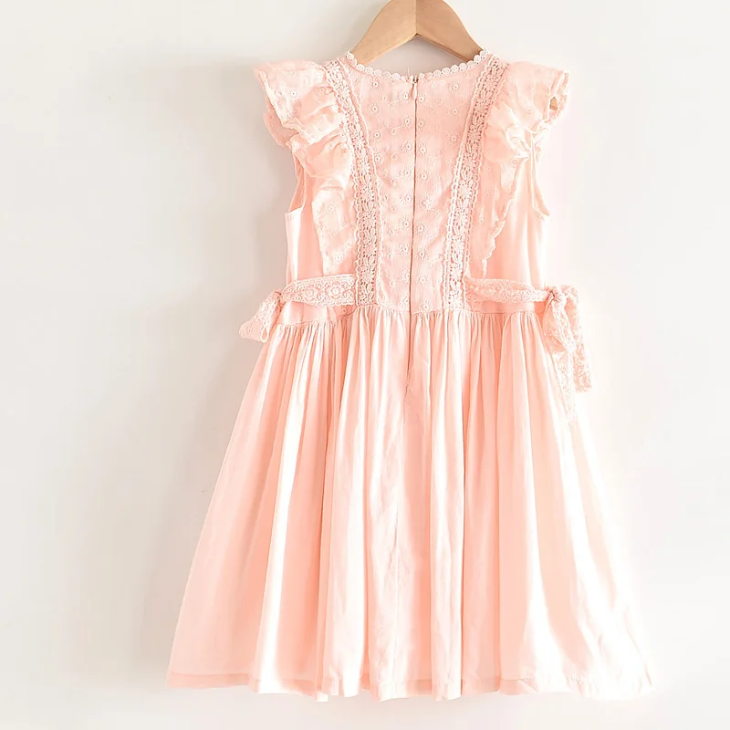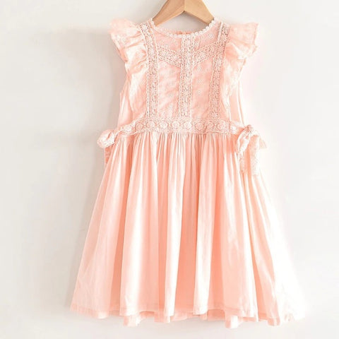Perfect for any special occasions, this beautiful lace embroidery dress features a detailed lace design on its front, ruffles sleeveless, and a ribbon tie on both sides waist. It is soft and comfy to wear.