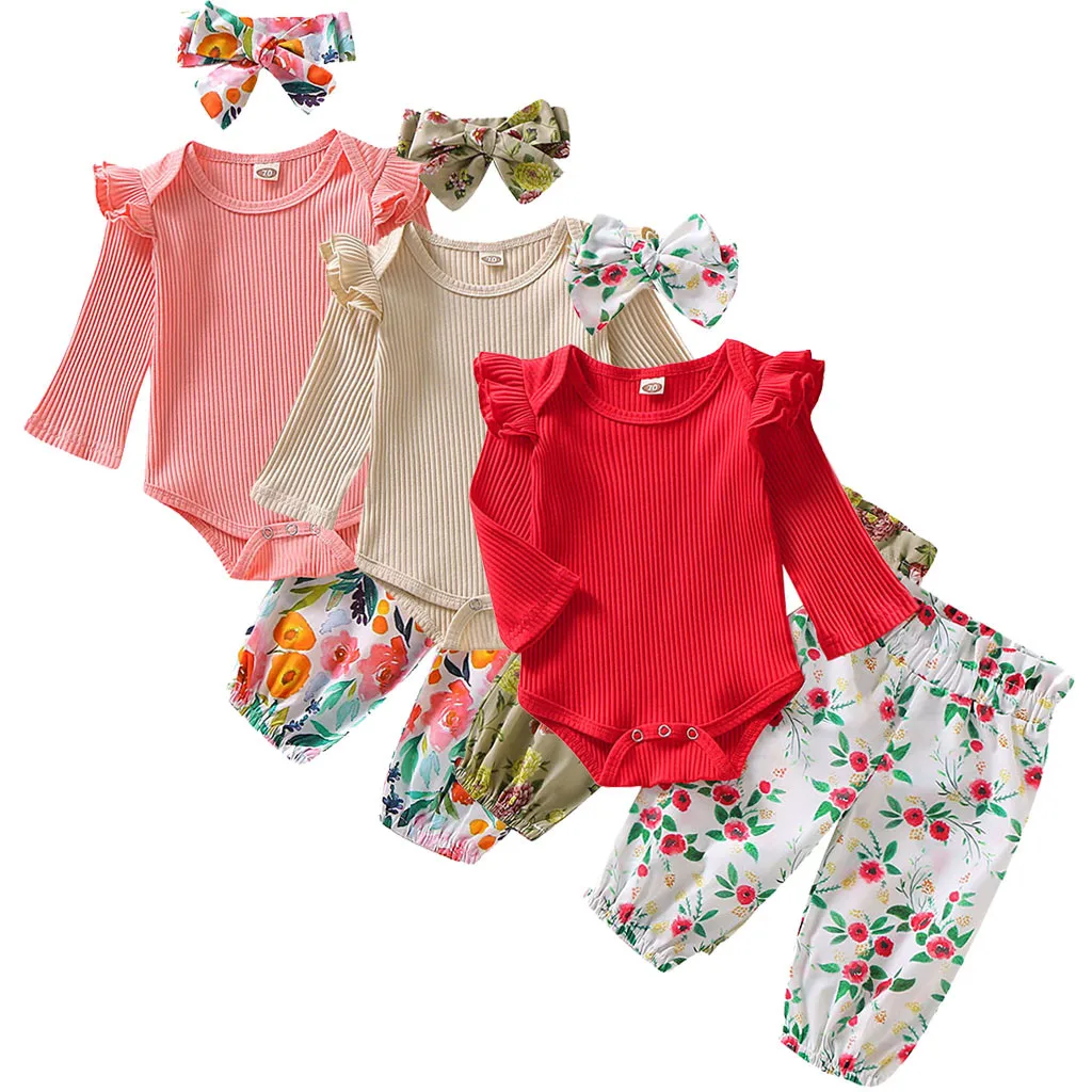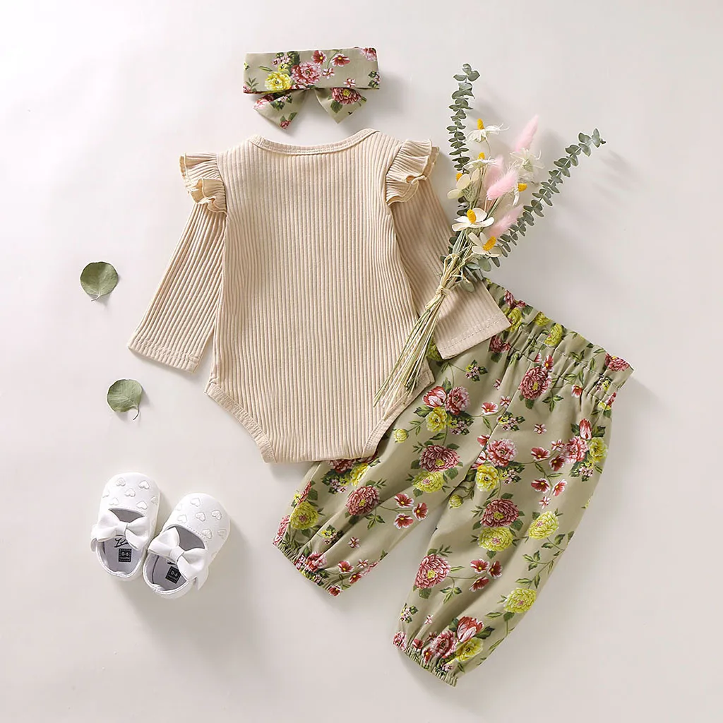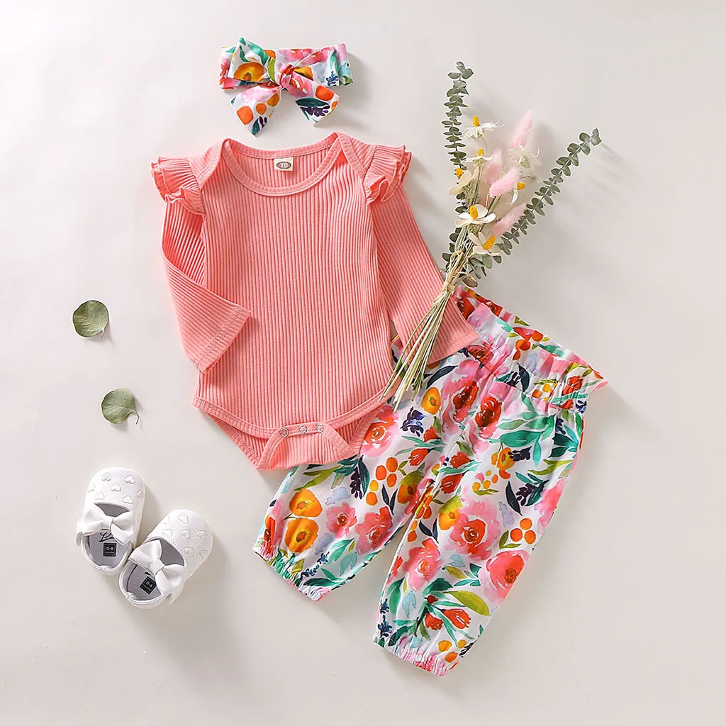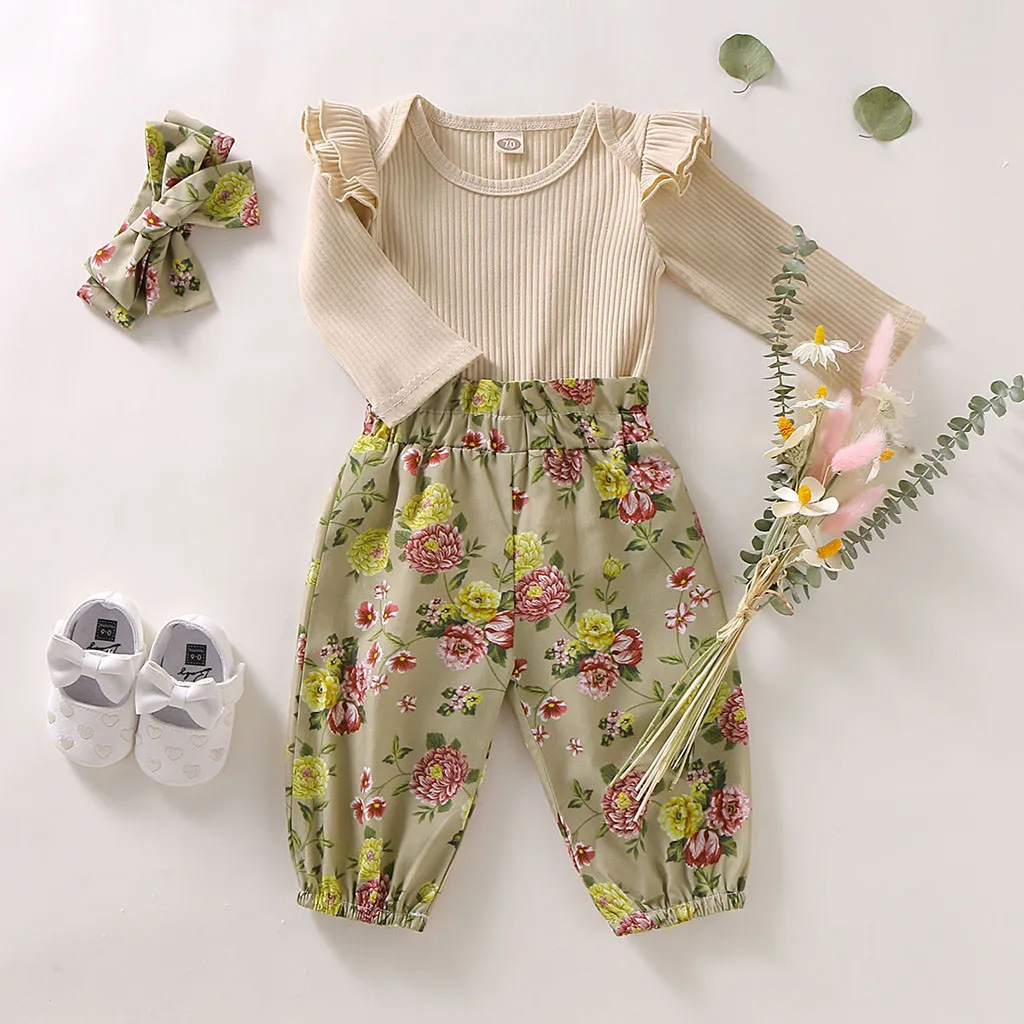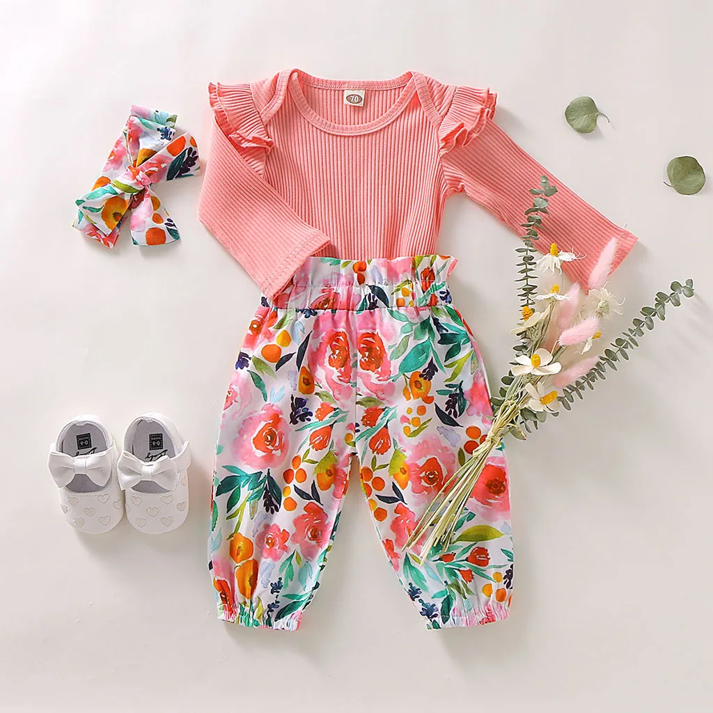 When it comes to adorable fashion that your little ones will love this long sleeve floral romper outfit. This pretty cotton outfit is perfect for a playday or going to the park. Your little one will look cute in this outfit. Set includes a long-sleeve ruffle romper, hairband and floral bloomer pants.