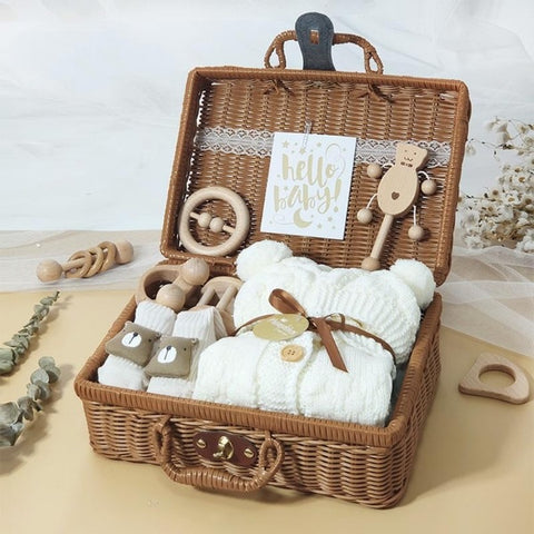 Your little bundle of joy deserves the best. This is a gift that is not just adorable but it's also organic that is very suitable and best for babies. The beautiful new baby gift collection would make the perfect gift for baby shower surprises. It has two sets you can choose from. Each set includes a onesies jumpsuit, wood toys, and socks. It is packed in a beautifully crafted rattan suitcase that you will really adore.