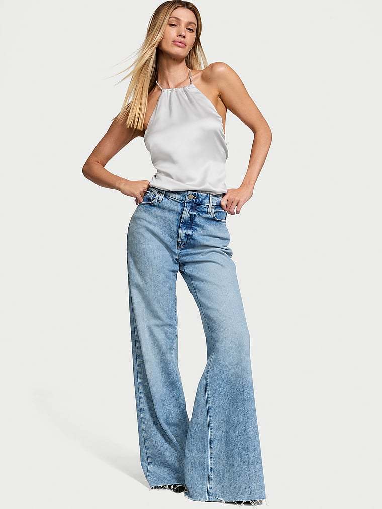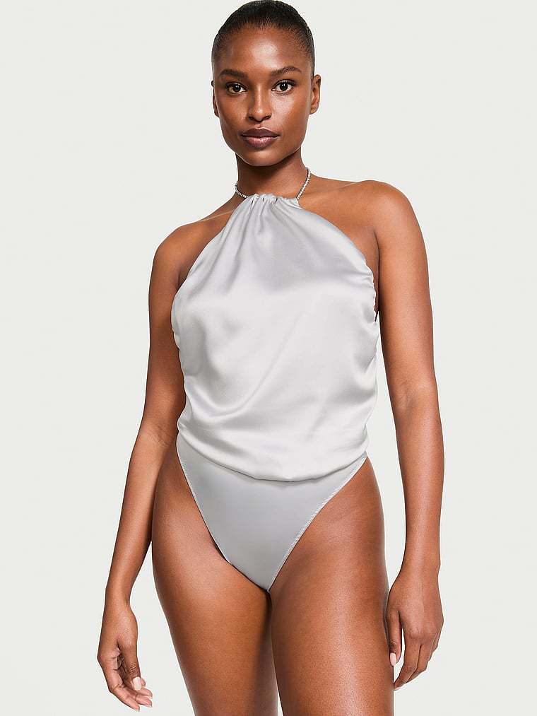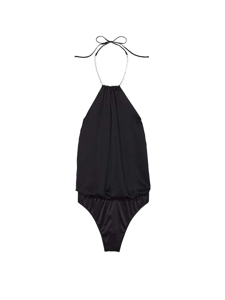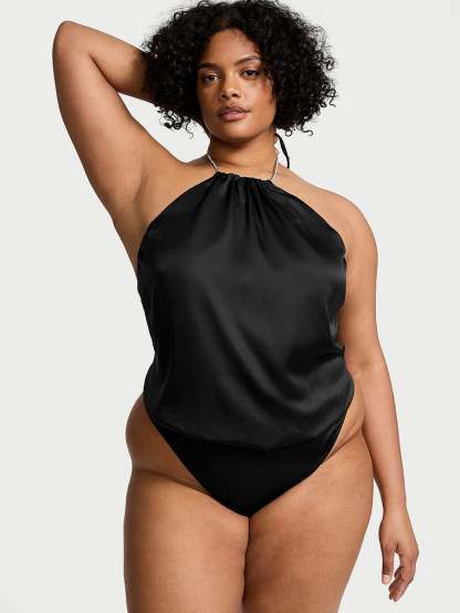 Sultry halter styling is sparked with dazzling crystals at the tie-back neck of this exquisite, draped-satin design. Wear for a night in or pair it with denim for a stunning going-out style.