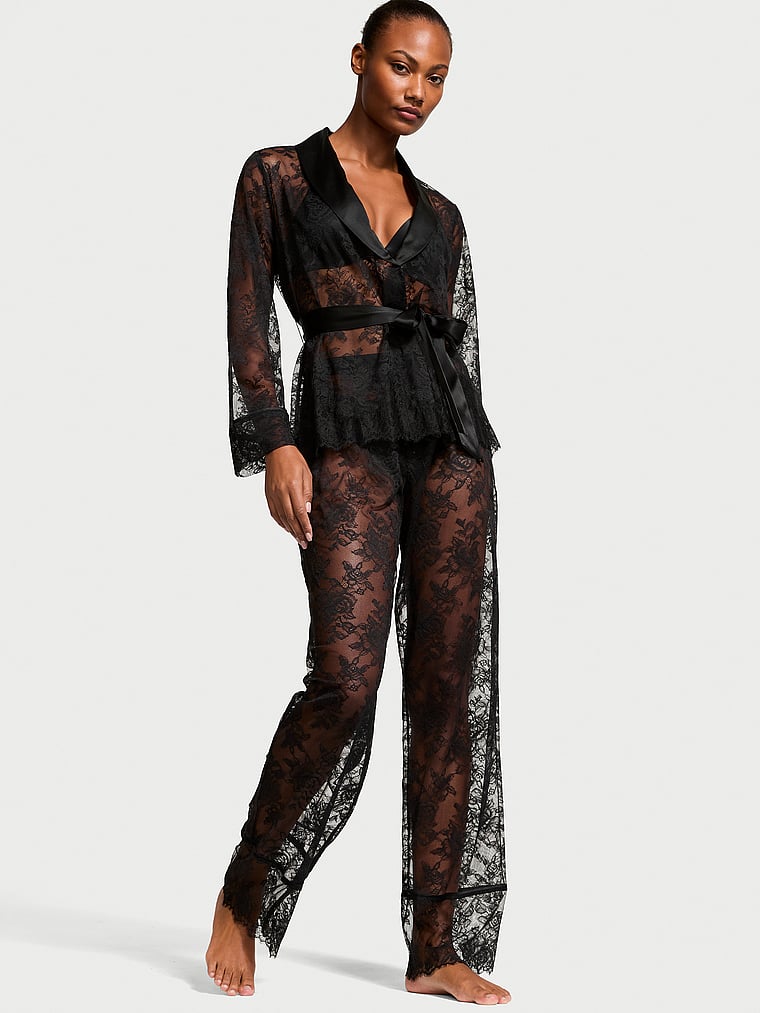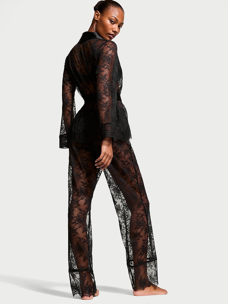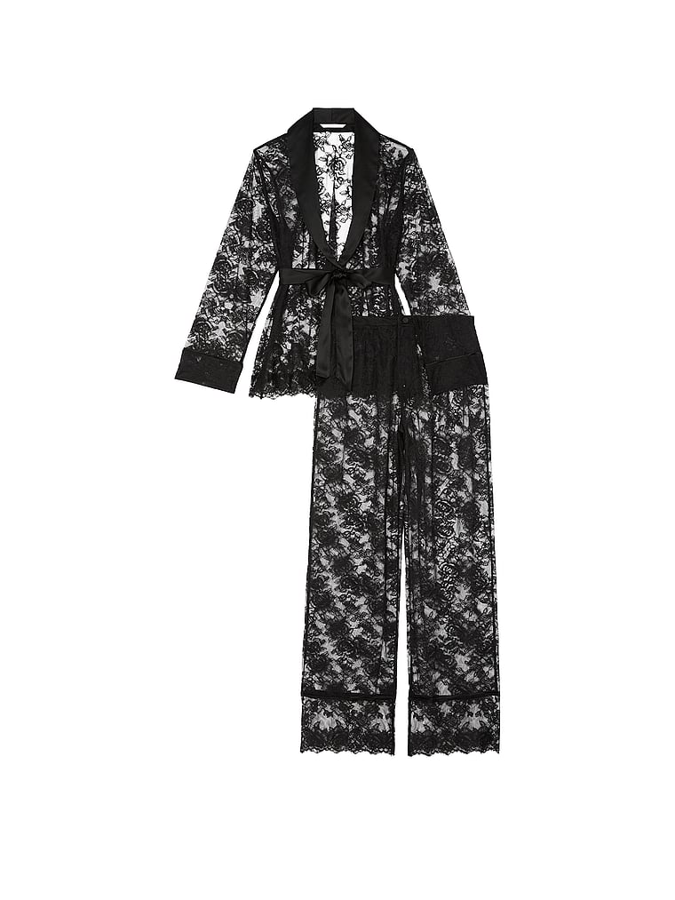 Unexpected in sheer rose lace, this ultra-chic set is up for anything. Inspired by glamorous vintage nightwear, these pieces are made with attention to exquisite details, right down to the pure silk at the shawl collar and tie belt.
