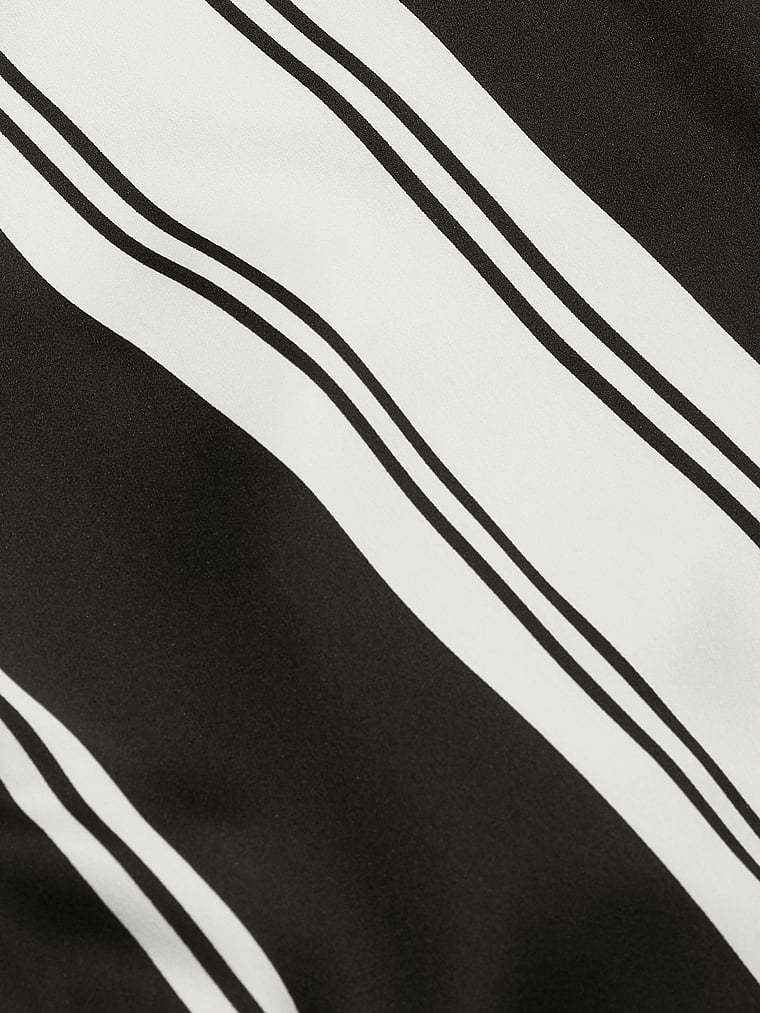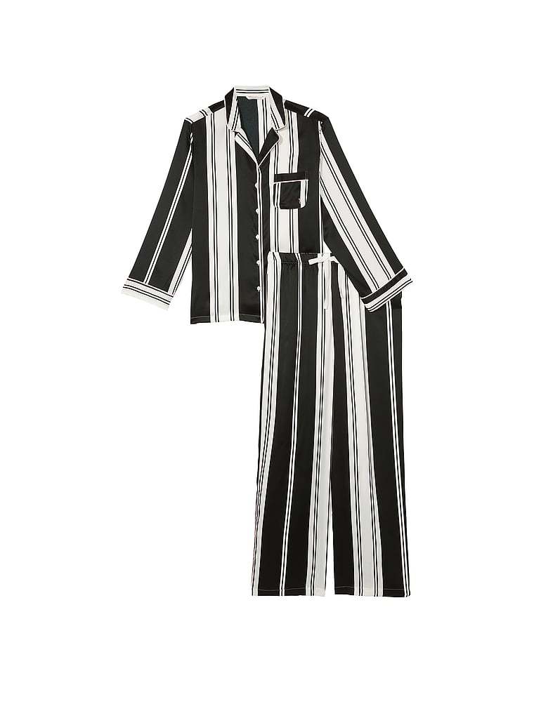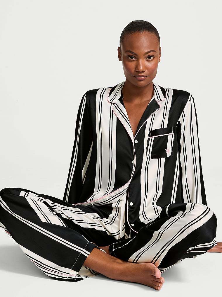 Now entering sleep mode. Wind down in this satin pant and matching long-sleeve top with a chest pocket, notch collar, and decorative piping.