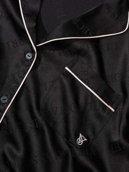 Now entering sleep mode. Relax in this satin pant and matching long-sleeve top with a chest pocket, notch collar, and decorative piping.