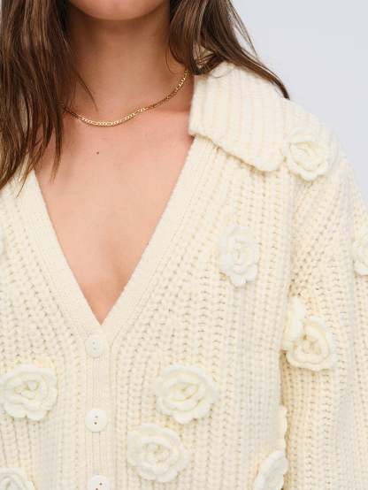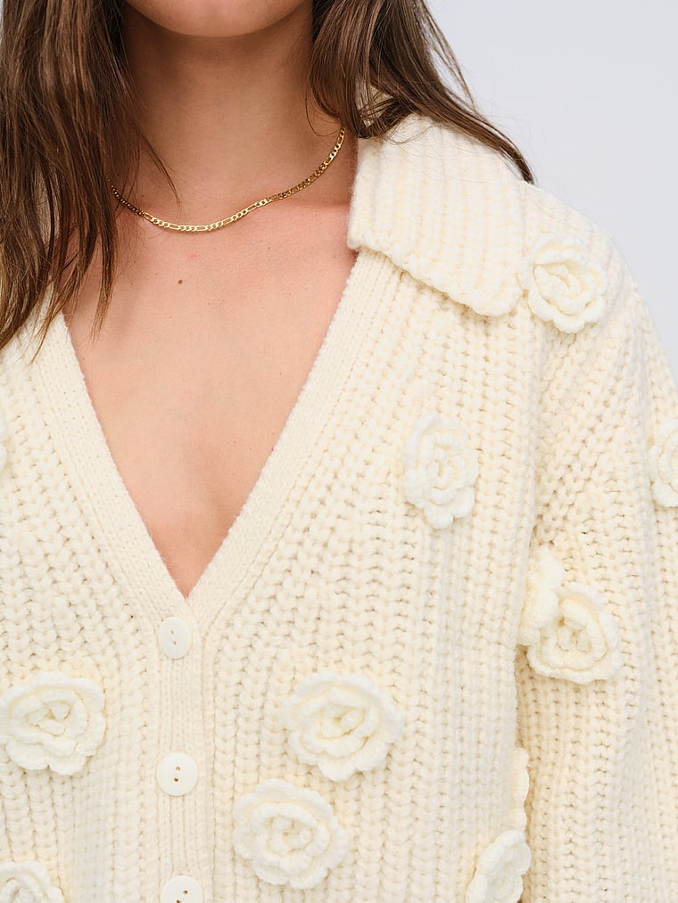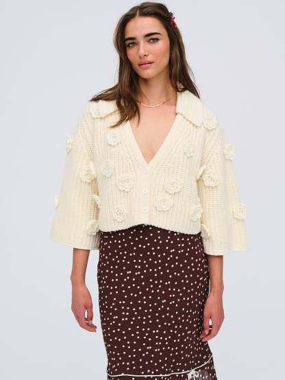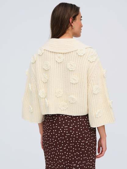 Sweater weather never looked so sweet as with this chunky cardigan, adorned with decorative 3D flowers and three-quarter-length sleeves.