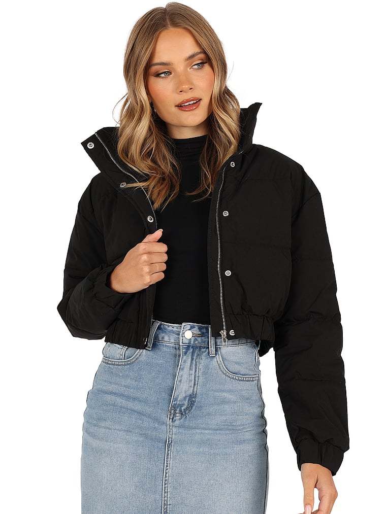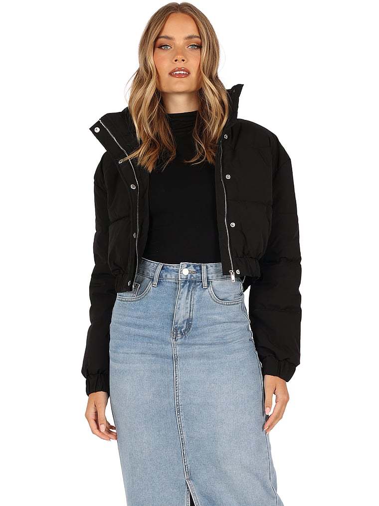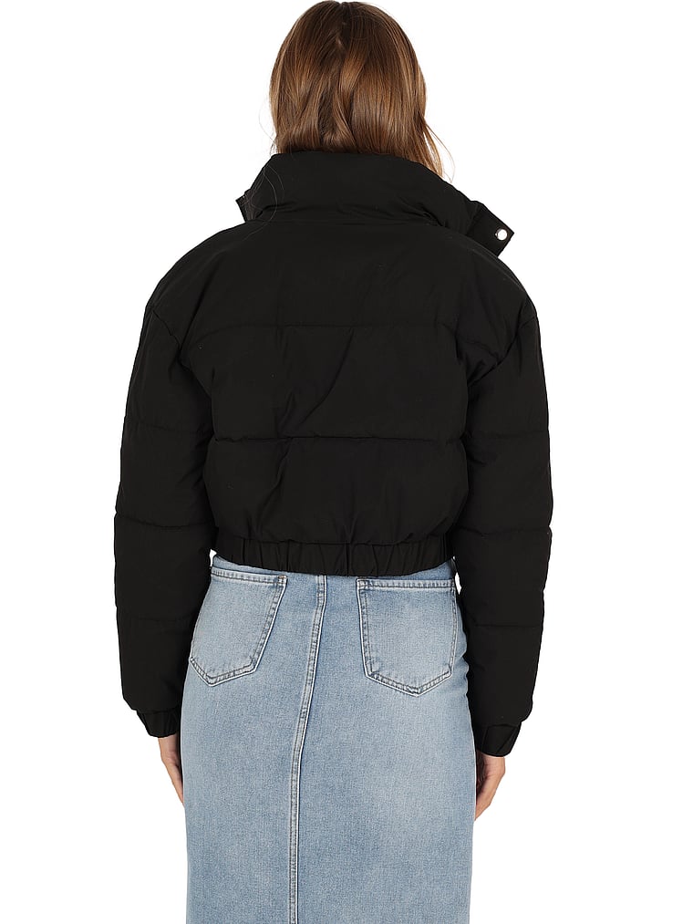 This cropped mock-neck puffer serves up hot style when temps get cold. It zips up in the front and has elastic cuffs to keep you warm and snug, no matter the weather.