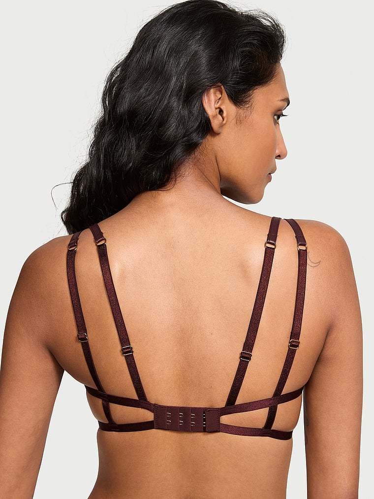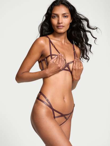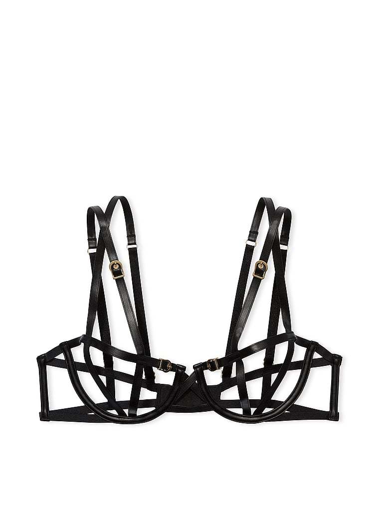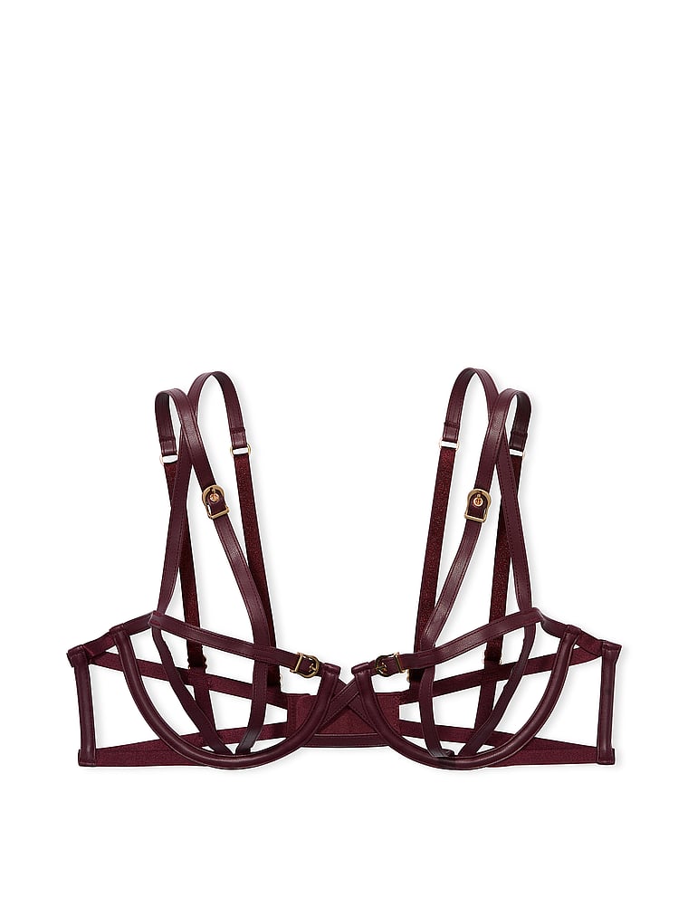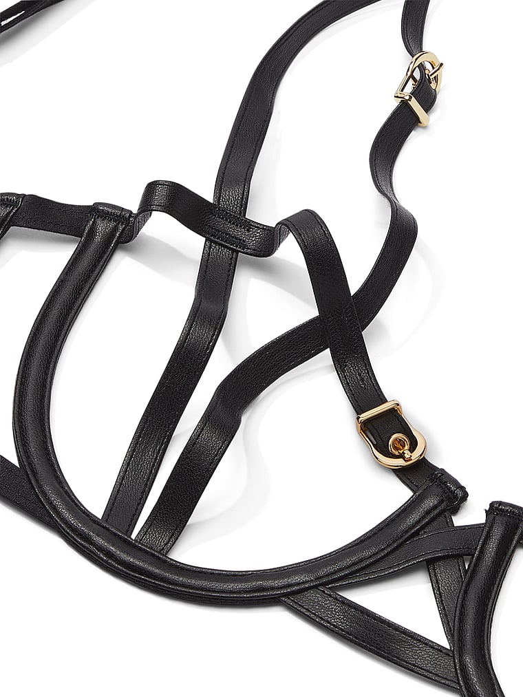 Edgy, faux-leather straps are artfully arranged to create this open-cup stunner. Gleaming golden buckle hardware finishes the daring design. Pair with the matching crotchless Panty for the full look.