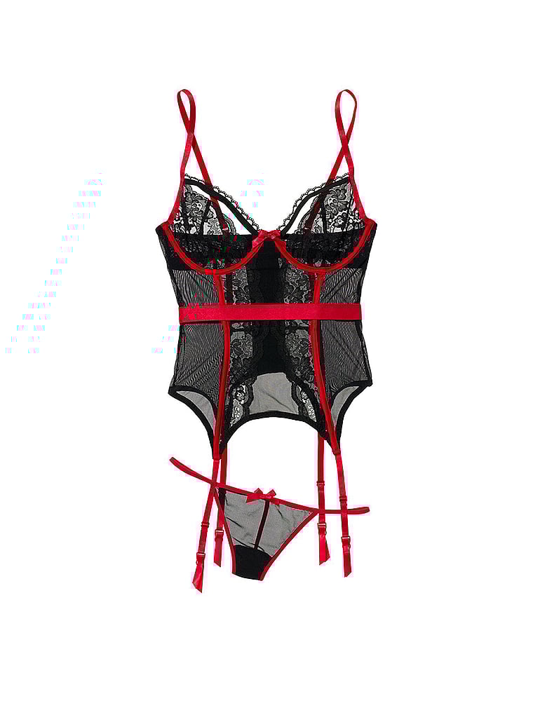 Go for the bold with this statement set featuring a mix of sexy straps, luxe lace, and airy mesh all tied together with a satin elastic waistband.