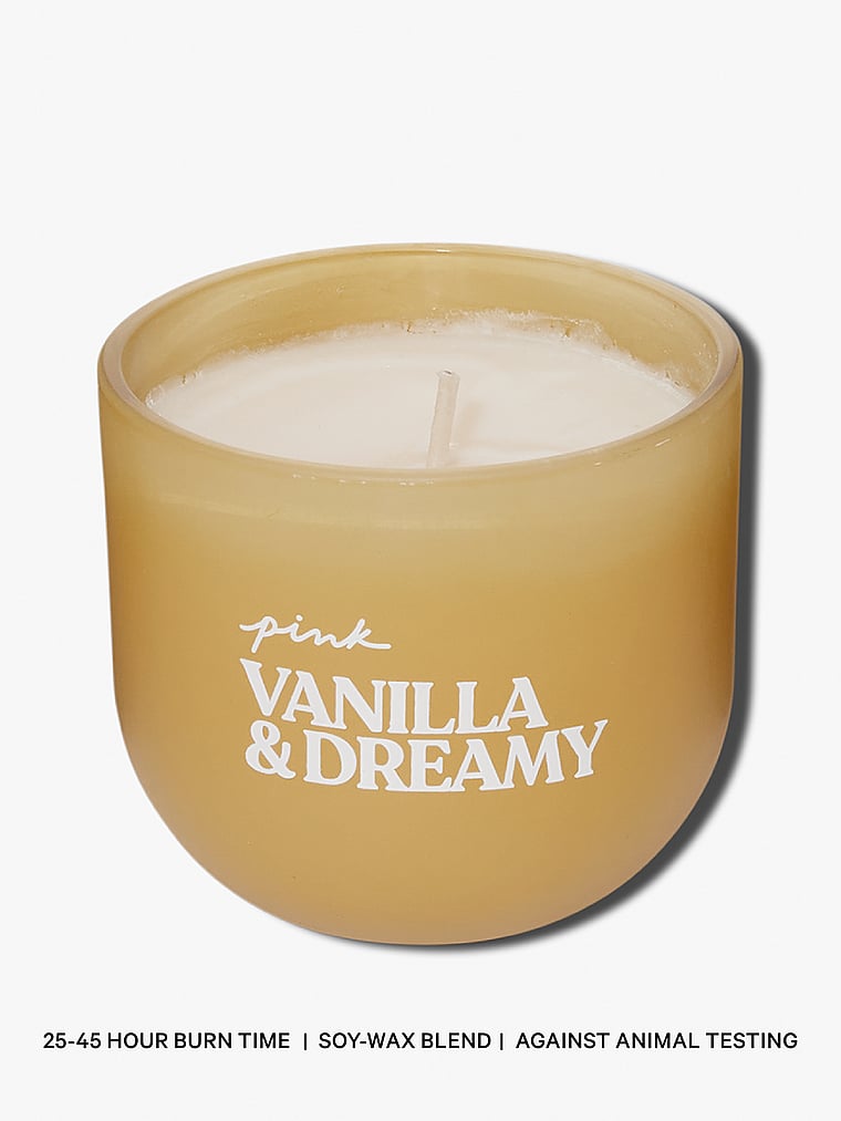 Get your signature PINK scent in candle form. This soy-wax blend candle smells just like our new Vanilla & Dreamy fragrance.