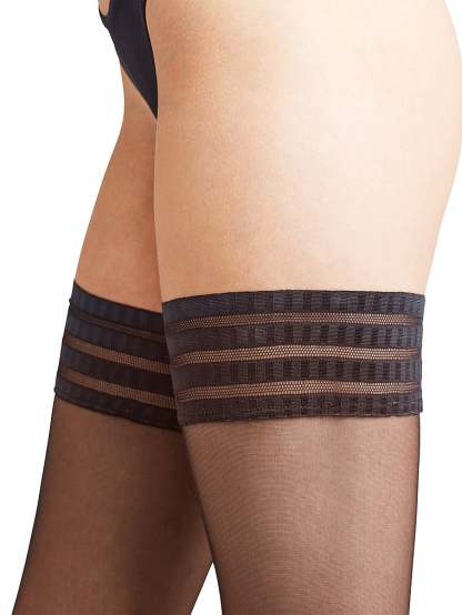 The stays-in-place thigh high you've been searching for. These sheer thigh highs are accented with trim and outfitted with a perfect-grip silicone coating. Run-resistant toes with a soft seam finish let you wear them all day without a care. By FALKE.