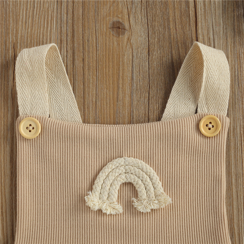 Dress your little one in this adorable rainbow romper for a summer-ready look. Our rainbow rompers featuring a bold and fun print, elastic leg cuffs, tie-up shoulder straps, and snap buttons at the front of the suit. Made of breathable material so they'll be cool regardless of how warm the weather gets. This delicate and vintage-style romper makes the sweetest addition to your baby's collection.