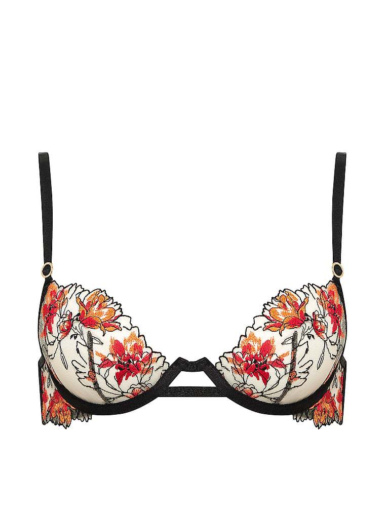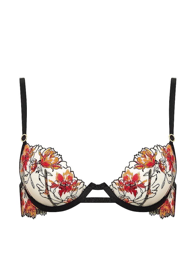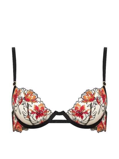 Delicate floral embroidery in shades of orange and red adorns this semi-sheer underwired bra, accentuated with gold-tone hardware. Pair it with the matching panty for a complete set.