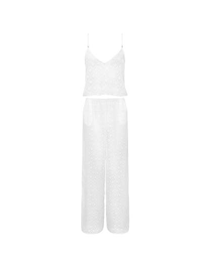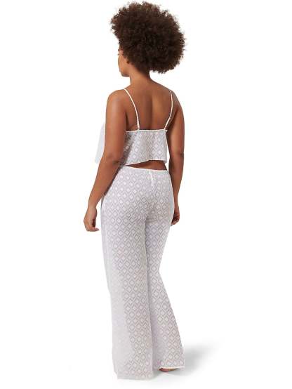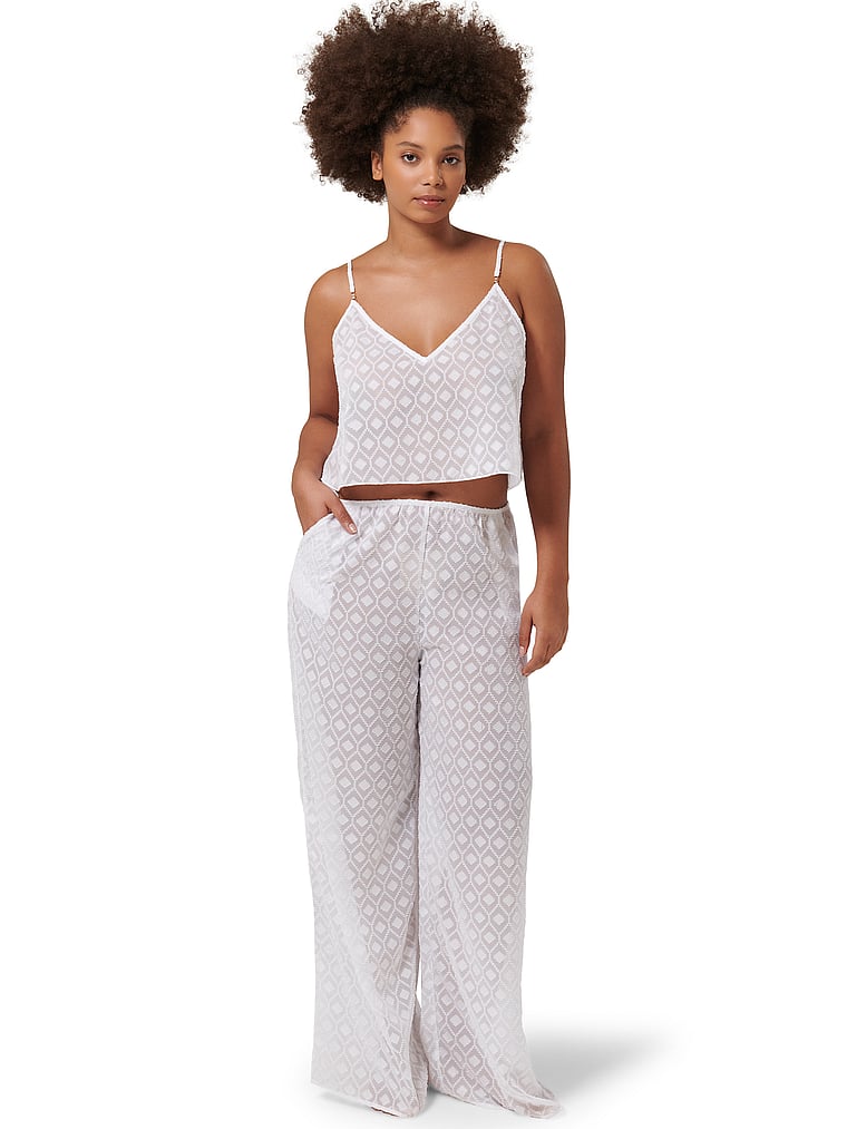 Crafted from a sheer fabric and finished with a playful pattern, this flowy set features a Cami top with a sweet V-neckline and matching wide-legged Pants for a chic lounge look.