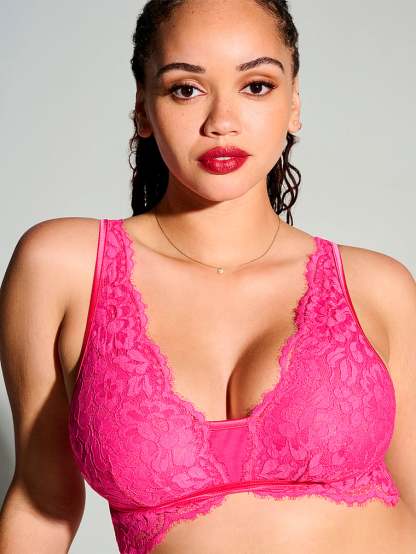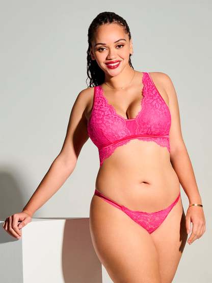 Elegant lace meets playful eyelash trim in this bold, low-plunge style.