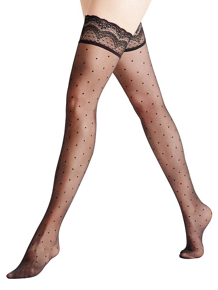 A classic that goes perfectly with any outfit and occasion, these sheer thigh highs, accented with modern polka dots are finished with a subtle shimmering finish and an elegant lace top. Non-slip silicone backing keeps them in place. By FALKE.